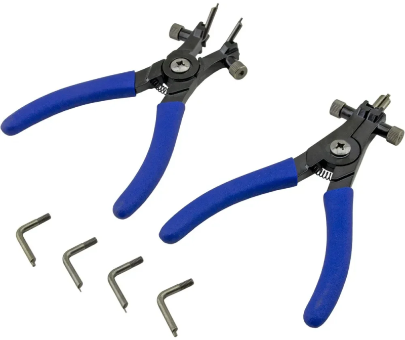 - В комплекте четыре пары сменных наконечника из закаленной стали различного диаметра (0.8, 1.2, 1.4, 2.0 мм) - для монтажа различных типоразмеров стопорных колец.
