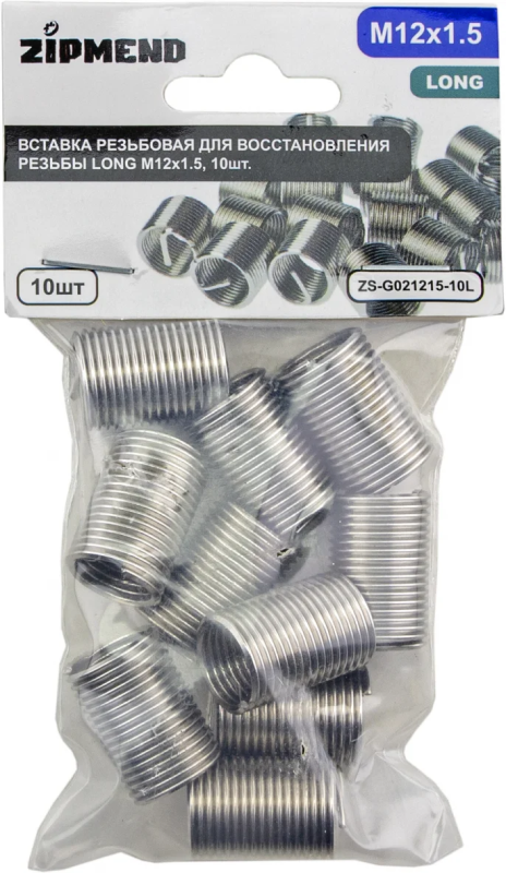 Вставка резьбовая для восстановления резьбы LONG M12 х 1.5, 10 штук, ZIPMEND, ZS-G021215-10L.
