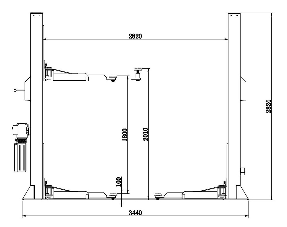 Двухстоечный электрогидравлический подъемник с верхней синхронизацией, грузоподъемность 4.5 т, высота колонны 4035/4313мм, механическое управление стопорами на одной колонне.