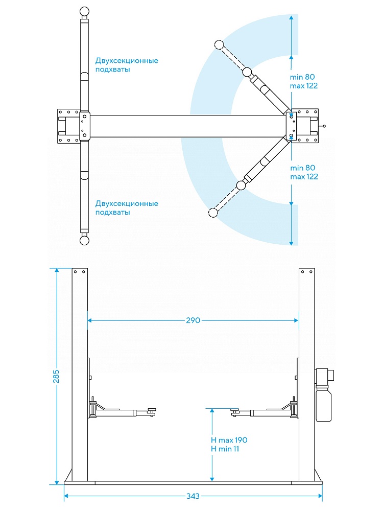 Классическая симметричная конструкция с двухсоставными подхватами низкого профиля позволяет обслуживать машины с низким клиренсом.