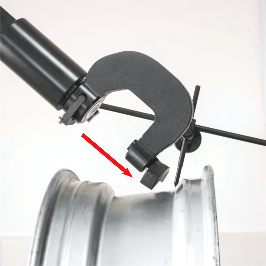Обновленный стенд получил специальную конструкцию – мост с навесным оборудованием, устанавливаемый на место классических упоров. При этом на мост устанавливаются свои, специальные упоры, полностью замещающие старые и расширяющие возможности ремонта колесных дисков. Также на мост установлен винтовой упор, необходимый для правки сложных повреждений и повреждений типа «восьмерка», и специальный двухсторонний гидроцилиндр с захватом. Конструкция гидроцилиндра позволяет фиксировать его в любом положении и производить правку диска одной рукой, без удержания гидроцилиндра на весу.