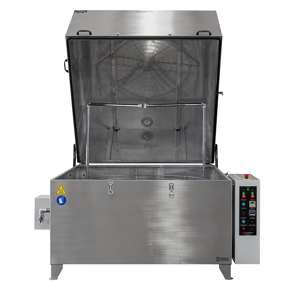 Температура и продолжительность цикла обработки задается на панели управления. Вращение корзины обеспечивает необходимое позиционирование деталей перед коллекторами. П-образная форма рамп позволяет промывать изделия сверху, снизу и сбоку в течение заданного времени. Автоматические промывочные установки серии АМ предназначены для использования со слабощелочными растворами. Для наполнения бака используется обычная водопроводная вода.
