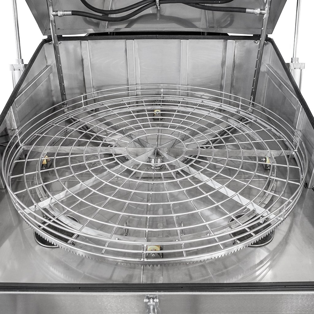 Линейка комплектуется двумя видами привода движения корзины – струйным и электромеханическим. При использовании электромеханического привода, корзина с деталями вращается равномерно с частотой 5-10 об/мин. Это обеспечивает высокое качество очистки, за счет равномерной подачи моющего раствора по всей поверхности деталей. Электромеханический привод является наиболее эффективным решением. Струйный привод накладывает ряд ограничений на эксплуатацию машины, такие как равномерное распределение изделий по весу в корзине, достаточную площадь поверхности деталей, соблюдение угла наклона.