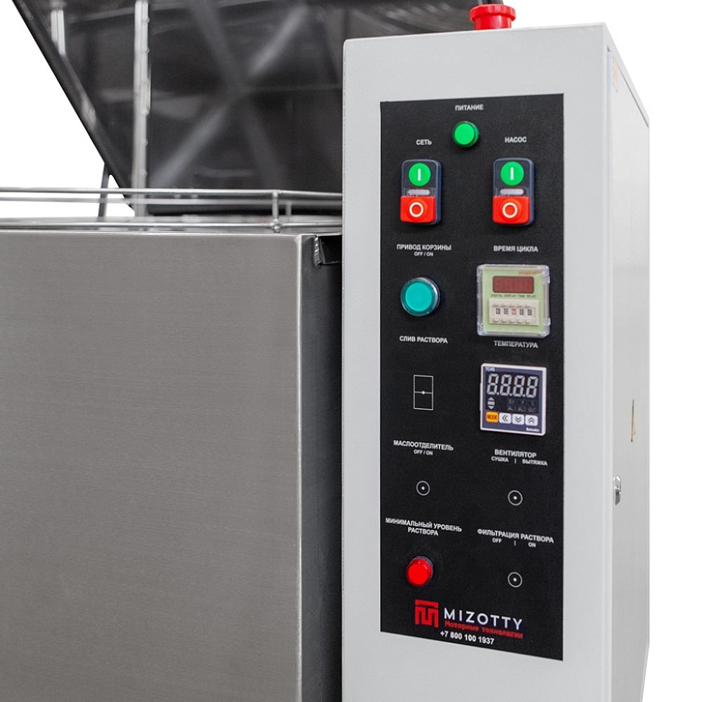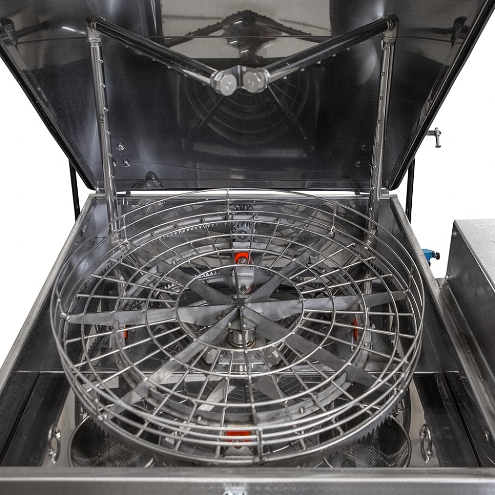 Линейка комплектуется электромеханическим приводом корзины с частотой вращения 5-10 об/мин., обеспечивающим высокое качество очистки, за счет равномерной подачи моющего раствора по всей поверхности деталей.