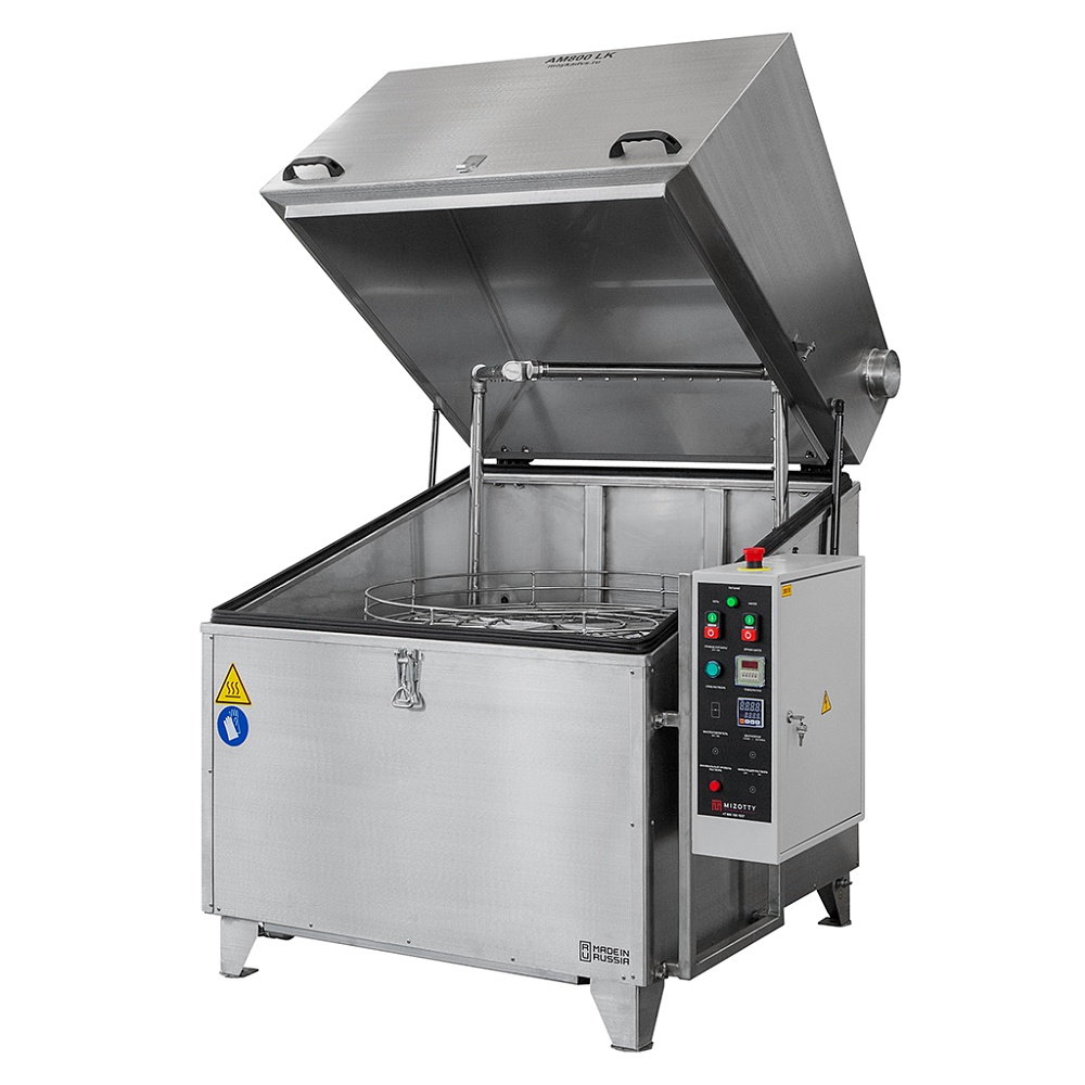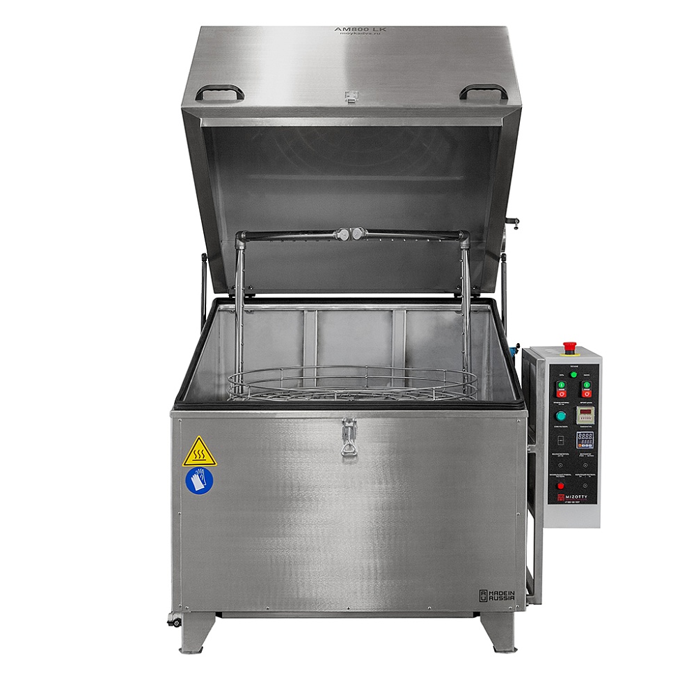 Температура и продолжительность цикла обработки задается на панели управления. Вращение корзины обеспечивает необходимое позиционирование деталей перед коллекторами. П-образная форма рамп позволяет промывать изделия сверху, снизу и сбоку в течение заданного времени. Автоматические промывочные установки серии АМ предназначены для использования со слабощелочными растворами. Для наполнения бака используется обычная водопроводная вода.