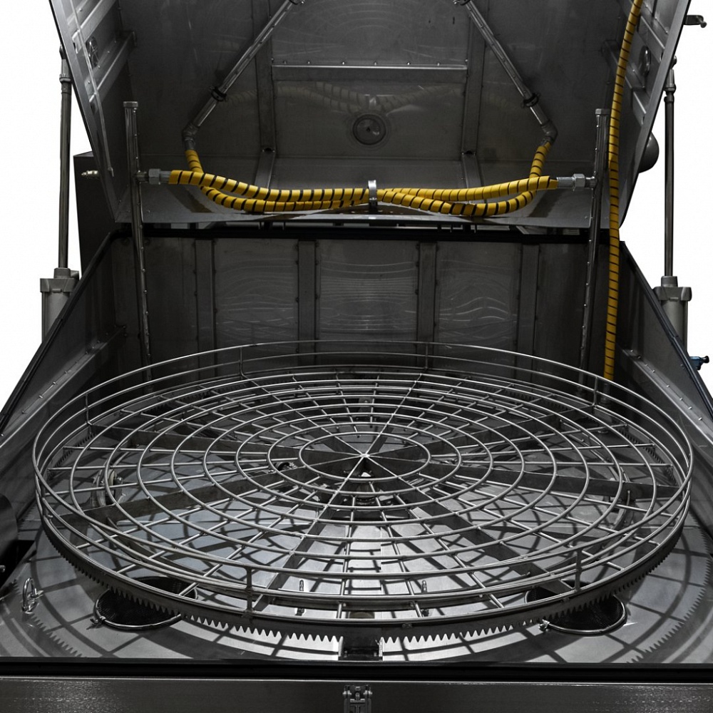 Линейка комплектуется двумя видами привода движения корзины – струйным и электромеханическим. При использовании электромеханического привода, корзина с деталями вращается равномерно с частотой 5-10 об/мин. Это обеспечивает высокое качество очистки, за счет равномерной подачи моющего раствора по всей поверхности деталей. Электромеханический привод является наиболее эффективным решением. Струйный привод накладывает ряд ограничений на эксплуатацию машины, такие как равномерное распределение изделий по весу в корзине, достаточную площадь поверхности деталей, соблюдение угла наклона.
