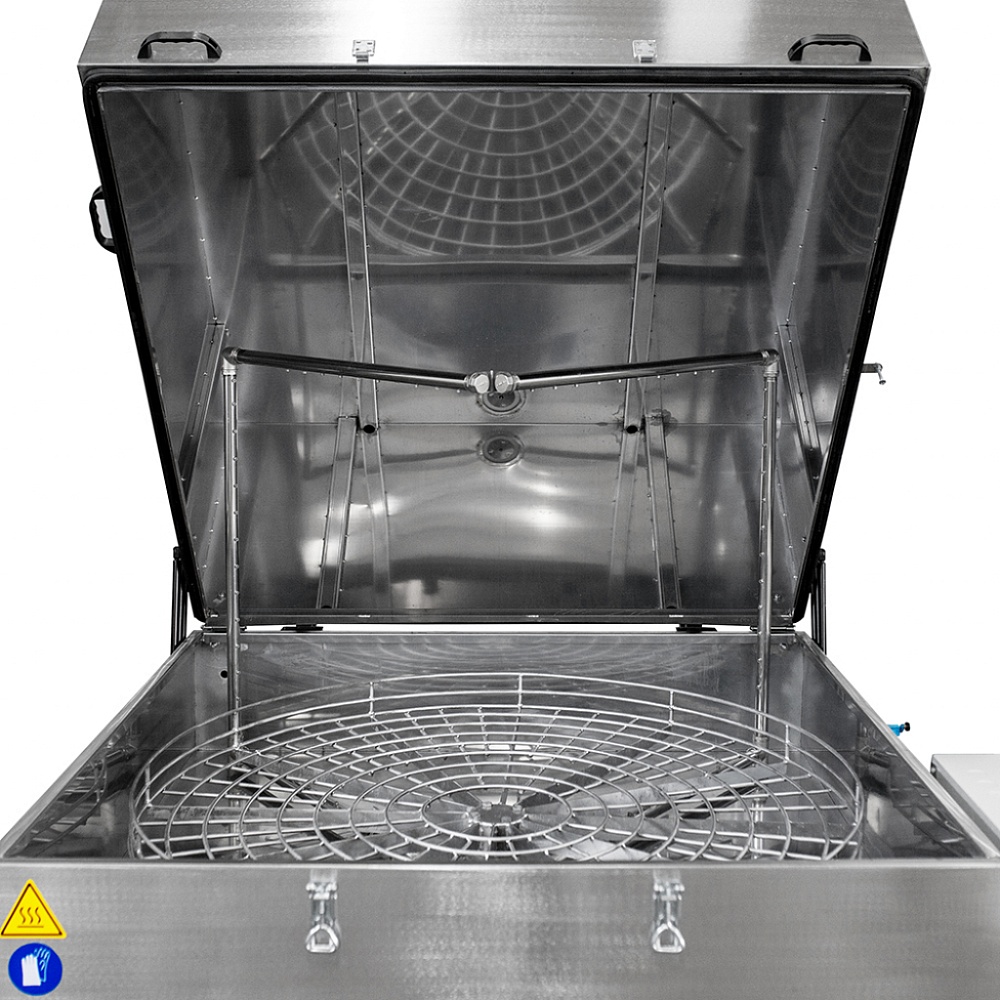 Температура и продолжительность цикла обработки задается на панели управления. Вращение корзины обеспечивает необходимое позиционирование деталей перед коллекторами. П-образная форма рамп позволяет промывать изделия сверху, снизу и сбоку в течение заданного времени. Автоматические промывочные установки серии АМ предназначены для использования со слабощелочными растворами. Для наполнения бака используется обычная водопроводная вода.