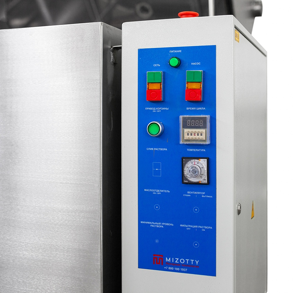Линейка комплектуется двумя видами привода движения корзины – струйным и электромеханическим. При использовании электромеханического привода, корзина с деталями вращается равномерно с частотой 5-10 об/мин. Это обеспечивает высокое качество очистки, за счет равномерной подачи моющего раствора по всей поверхности деталей. Электромеханический привод является наиболее эффективным решением. Струйный привод накладывает ряд ограничений на эксплуатацию машины, такие как равномерное распределение изделий по весу в корзине, достаточную площадь поверхности деталей, соблюдение угла наклона.