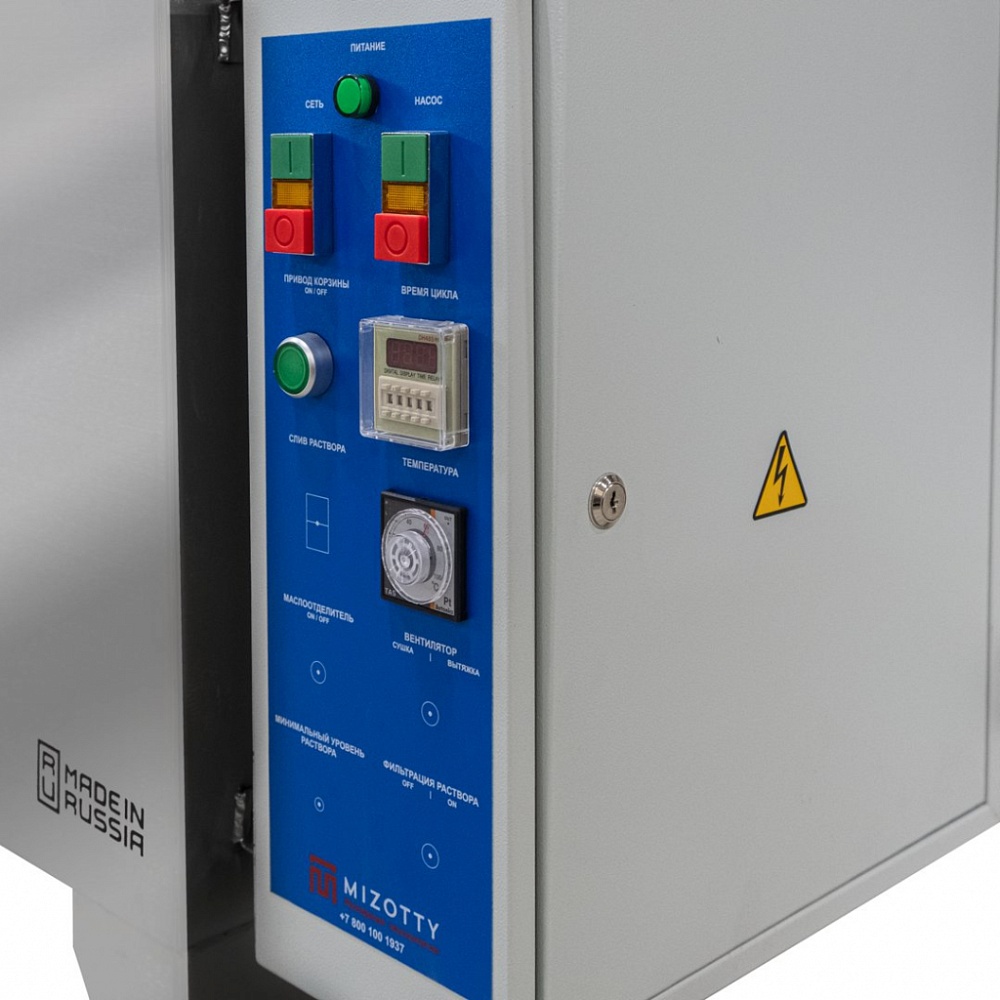 Температура и продолжительность цикла обработки задается на панели управления. Вращение корзины обеспечивает необходимое позиционирование деталей перед коллекторами. П-образная форма рамп позволяет промывать изделия сверху, снизу и сбоку в течение заданного времени. Автоматические промывочные установки серии АМ предназначены для использования со слабощелочными растворами. Для наполнения бака используется обычная водопроводная вода.