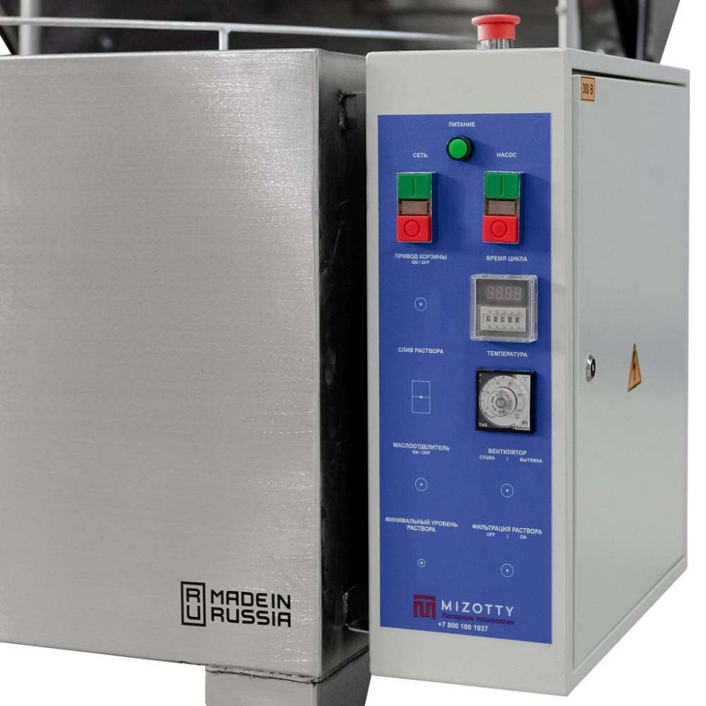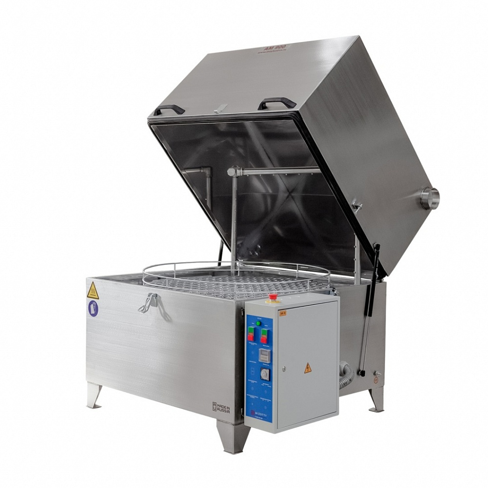 Температура и продолжительность цикла обработки задается на панели управления. Вращение корзины обеспечивает необходимое позиционирование деталей перед коллекторами. П-образная форма рамп позволяет промывать изделия сверху, снизу и сбоку в течение заданного времени. Автоматические промывочные установки серии АМ предназначены для использования со слабощелочными растворами. Для наполнения бака используется обычная водопроводная вода.