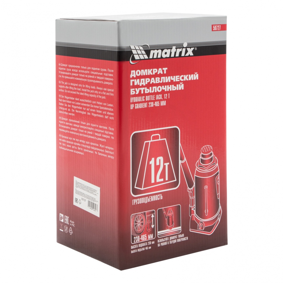 Домкрат гидравлический бутылочный Matrix 50727 используется для поднятия грузов массой до 12 т на высоту 230-465 мм. Подходит для автомобилей с высоким клиренсом. Домкрат будет полезен автолюбителям в гараже и дороге, а также сотрудникам СТО.