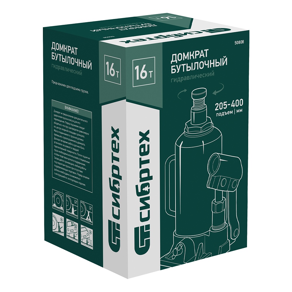 Домкрат гидравлический бутылочный Сибртех 50808 предназначен для подъема грузов массой до 16 т на высоту от 205 до 400 мм. Не требует больших усилий от пользователя и значительно облегчает рабочий процесс. Домкрат будет полезен при проведении техобслуживания машины в автосервисе или гараже.