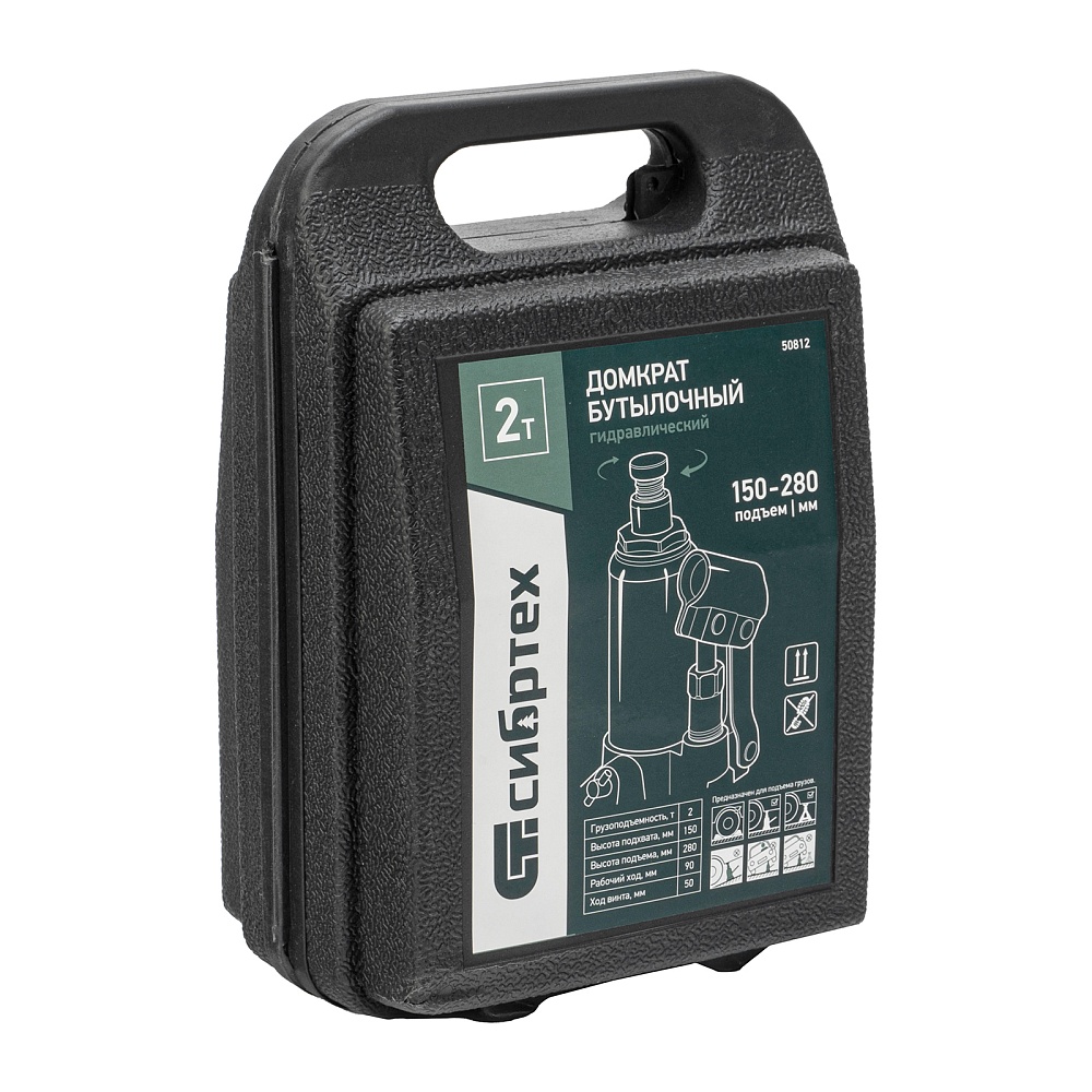 Домкрат гидравлический бутылочный Сибртех 50812, поставляющийся в пластиковом кейсе, предназначен для подъема грузов массой до 2 т на высоту от 150 до 280 мм. Не требует больших усилий от пользователя и значительно облегчает рабочий процесс. Домкрат будет полезен при проведении техобслуживания машины в автосервисе или гараже.