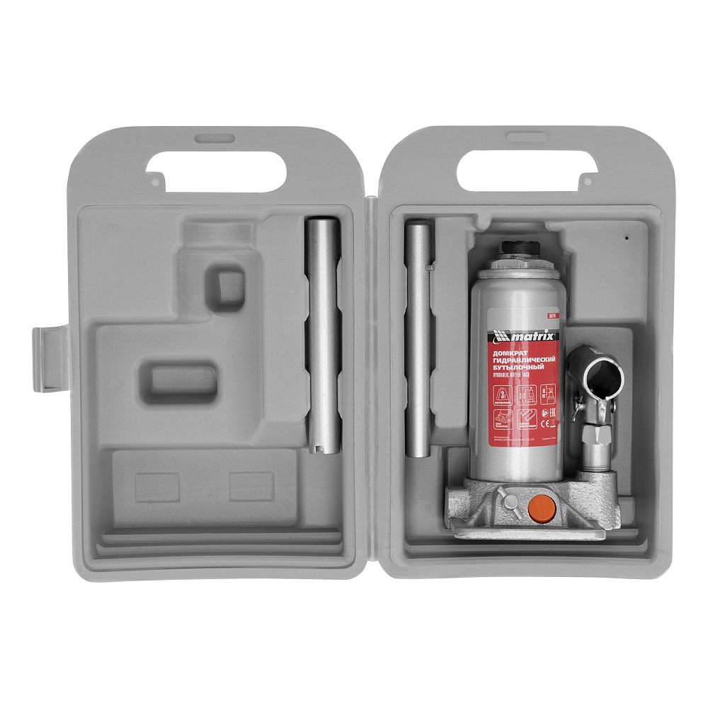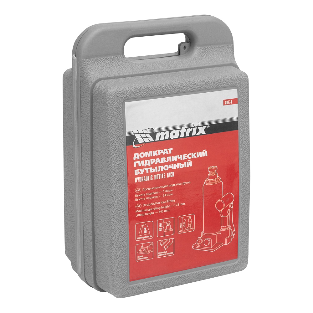 Домкрат гидравлический бутылочный, 3 т, h подъема 178-343 мм, в пластиковом кейсе Matrix