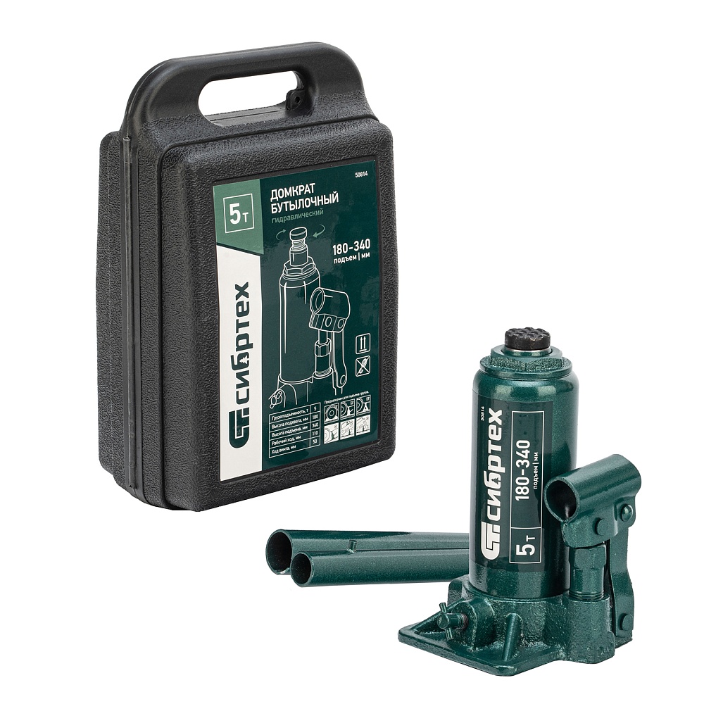 Домкрат гидравлический бутылочный Сибртех 50814, поставляющийся в пластиковом кейсе, предназначен для подъема грузов массой до 5 т на высоту от 180 до 340 мм. Не требует больших усилий от пользователя и значительно облегчает рабочий процесс. Домкрат будет полезен при проведении техобслуживания машины в автосервисе или гараже.