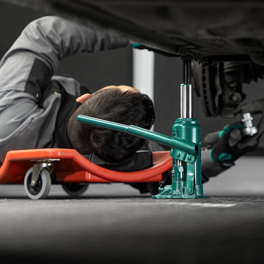 - Удобное хранение и транспортировка — домкрат весит всего 2,8 кг и поставляется в прочном пластиковом кейсе с рукояткой.