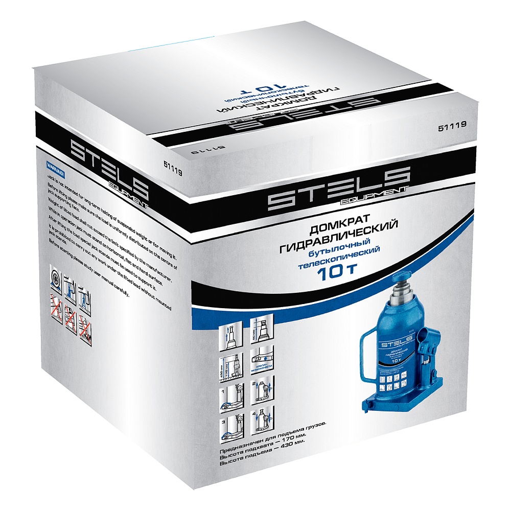 Гидравлический бутылочный телескопический домкрат Stels 51119 используется для поднятия грузов весом до 10 т с на высоту 170-430 мм. Не требует больших усилий и оптимален для автомобилей с большим клиренсом. Домкрат можно использовать в гараже для самостоятельного ремонта машины или в автосервисе для решения профессиональных задач.