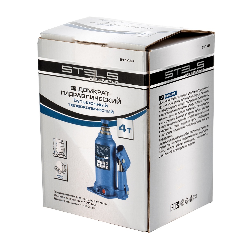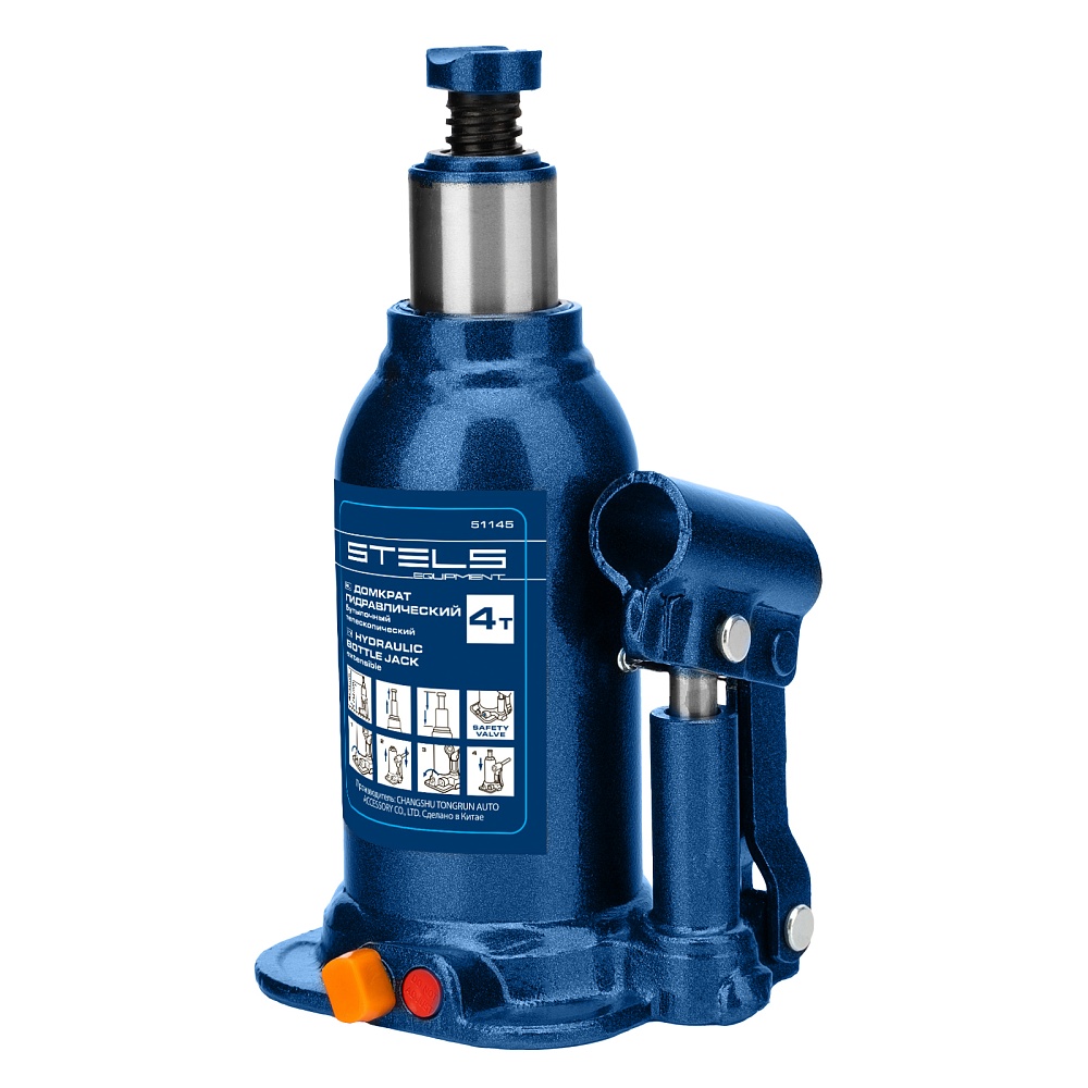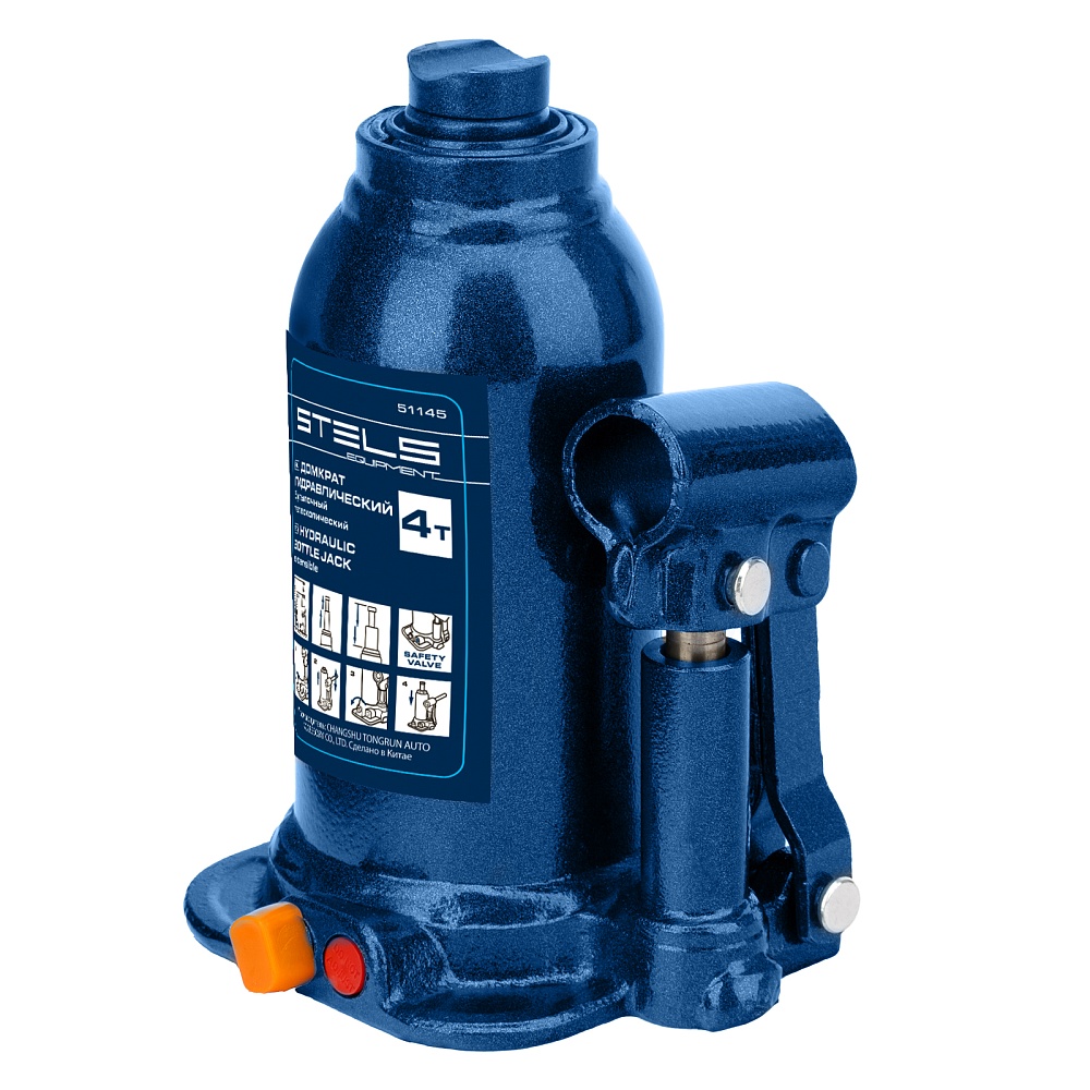 Гидравлический бутылочный телескопический домкрат Stels 51145 используется для поднятия грузов весом до 4 т с на высоту 170-420 мм. Не требует больших усилий и оптимален для автомобилей с большим клиренсом. Домкрат можно использовать в гараже для самостоятельного ремонта машины или в автосервисе для решения профессиональных задач.