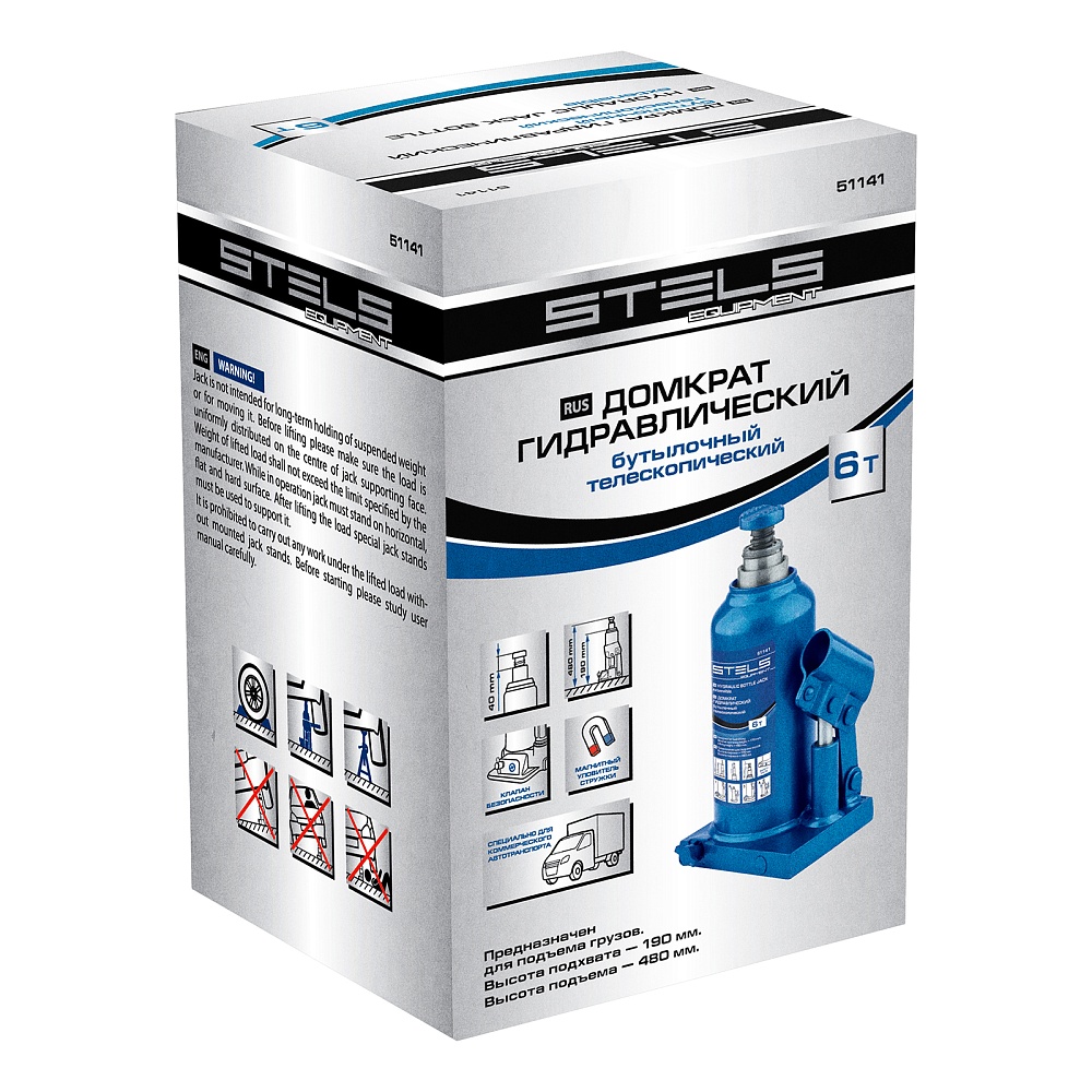 Гидравлический бутылочный телескопический домкрат Stels 51141 используется для поднятия грузов весом до 6 т с на высоту 190-480 мм. Не требует больших усилий и оптимален для автомобилей с большим клиренсом. Домкрат можно использовать в гараже для самостоятельного ремонта машины или в автосервисе для решения профессиональных задач.