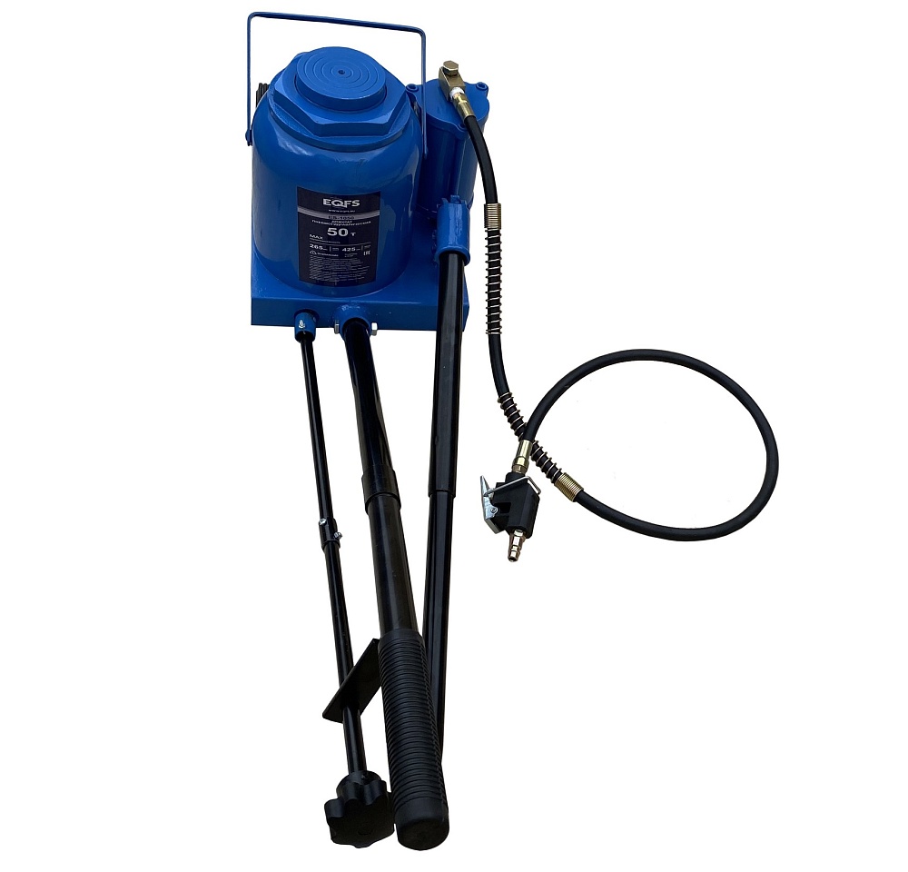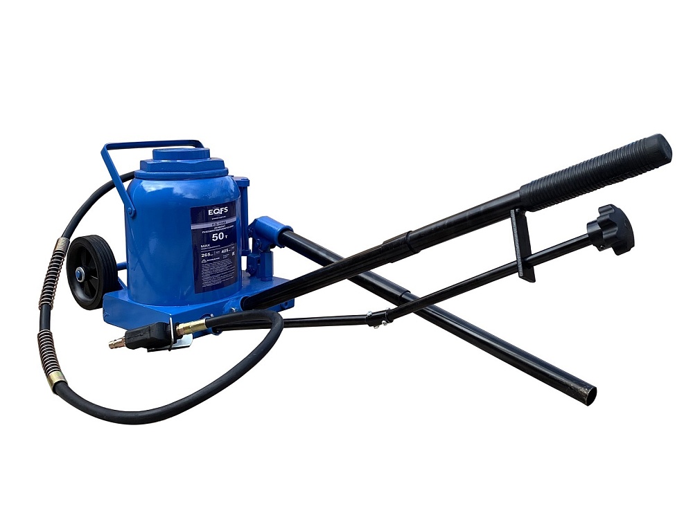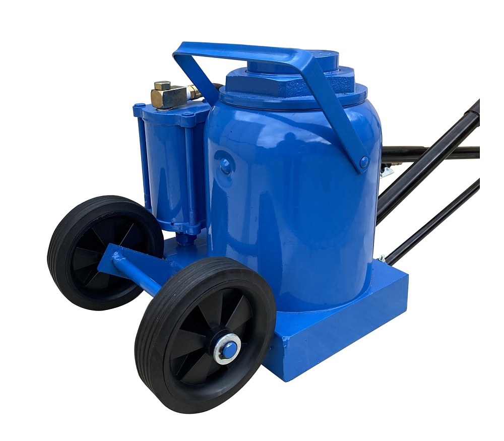 Пневмогидравлический. г/п 50т. Подхват под раму и мосты грузовых автомобилей и спецтехники. Увеличенный диаметр металлических колес домкрата, позволяет легко транспортировать его по не ровным поверхностям.  Можно поднимать автомобили для ремонта ВМЕСТЕ С ГРУЗОМ. Высота подъема 265-425мм. Ход поршня 160 мм.<br /><br />Технические особенности (Грузовой подкатной пневмогидравлический домкрат 50 тонн):<br />Домкрат рекомендуется к применению в шиномонтажных мастерских, автосервисах и авторемонтных предприятиях.<br />Диаметр металлических колес домкрата, позволяет легко транспортировать его по не ровным поверхностям цеха.<br />Рукоятка привода домкрата с обрезиненной ручкой – не скользит<br />Пневмогидравлический привод подъема домкрата, позволяет быстро и без усилий вывесить автомобиль. В том числе и с грузом, что очень удобно при ремонте колес на трассе.<br />Увеличенная длина домкрата позволяет производить подхват под раму и мосты грузовых автомобилей.<br />Для защиты от перегрузки и утечки предусмотрен специальный клапан.<br />Поставляется в фанерном ящике с обрешеткой.<br />Цвет – синий <br /><br /><br /><br />ВАЖНО!!!!!<br />ТРЕБУЕТСЯ ПОДКЛЮЧЕНИЕ К КОМПРЕССОРУ!!!