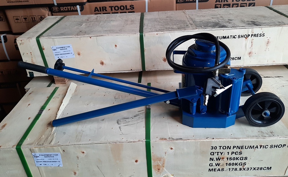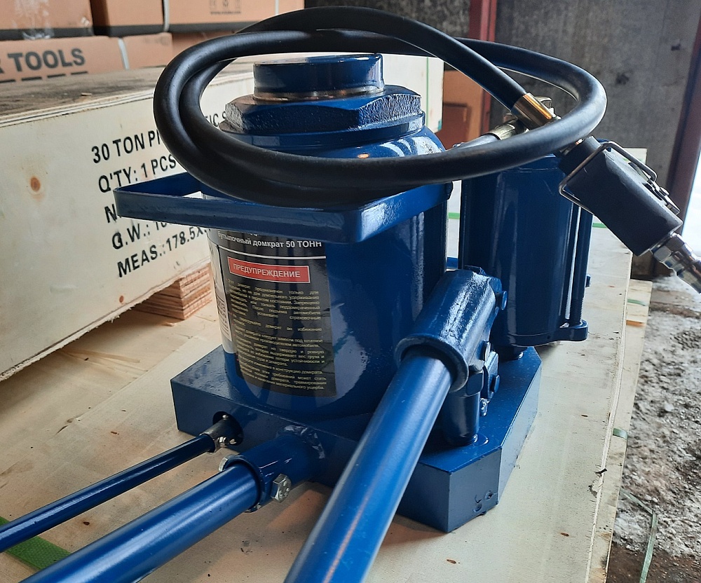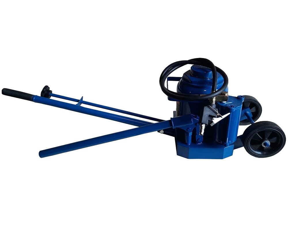 ОСОБЕННО УДОБЕН НА ТРАССЕ - можно поднимать автомобили для ремонта колес ВМЕСТЕ С ГРУЗОМ. Пневмогидравлический домкрат г/п 50т. Высота подъема 280-470мм. Ход поршня 190 мм. Домкрат для шиномонтажа грузовых автомобилей, автобусов и т.п. Цвет темно-синий.