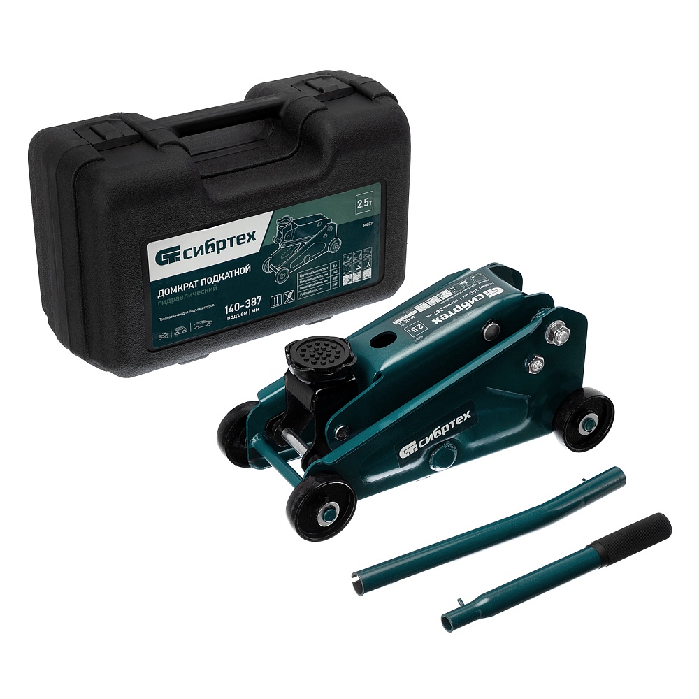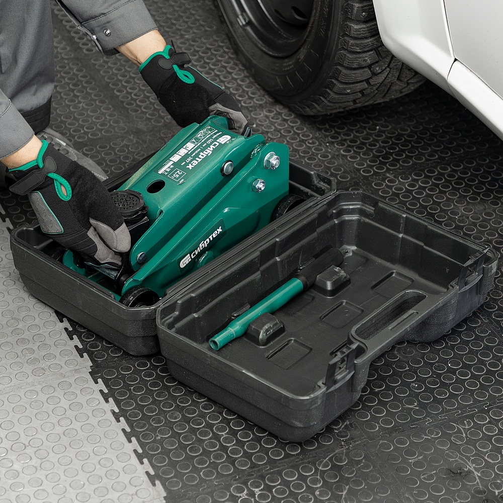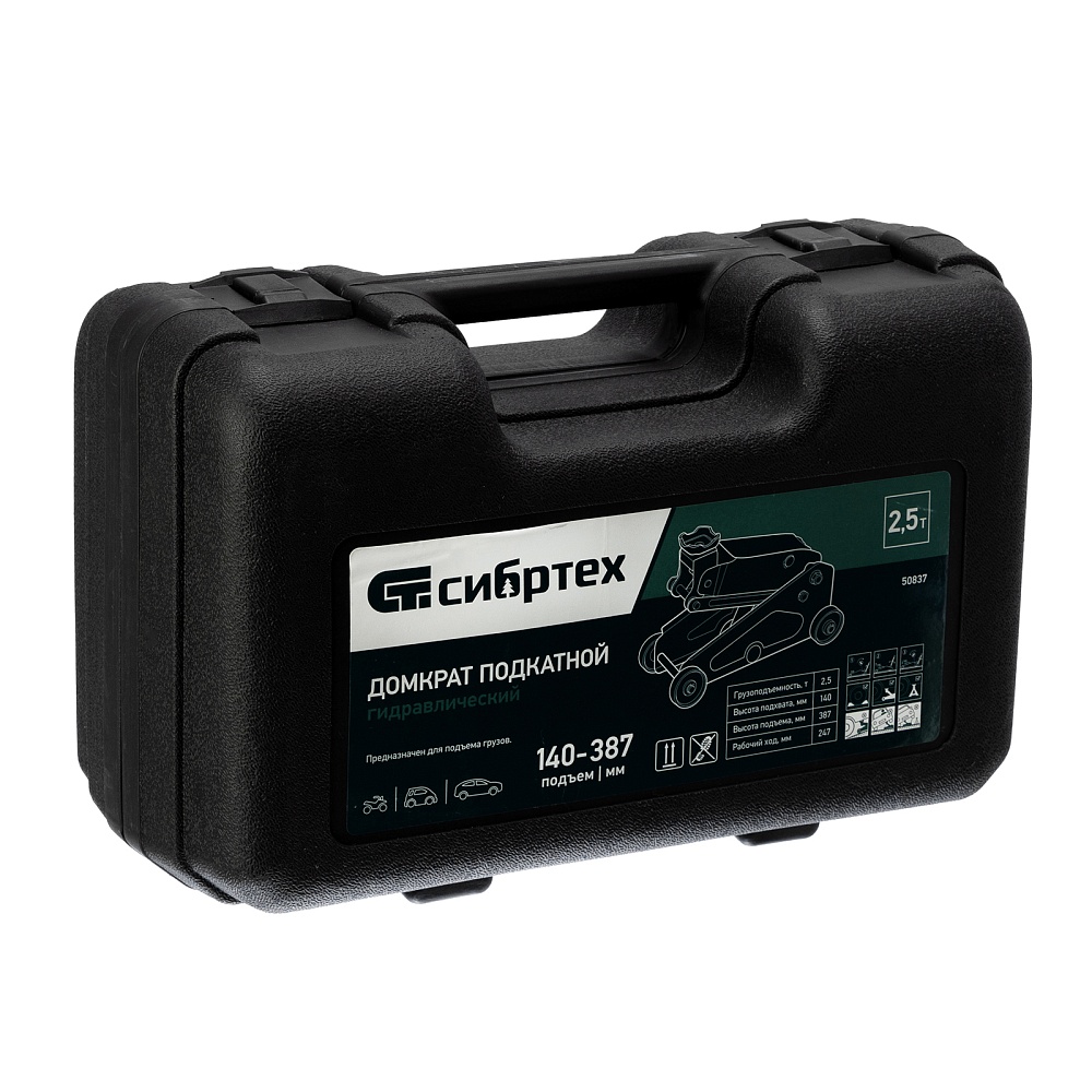 Гидравлический подкатной домкрат Сибртех 50837, поставляющийся в пластиковом кейсе, с высотой подхвата 148 мм, предназначен для подъема грузов массой до 2,5 т на высоту до 387 мм. Применяется для обслуживания автомобилей со стандартным клиренсом. Компактный домкрат подходит для самостоятельного использования автовладельцами.