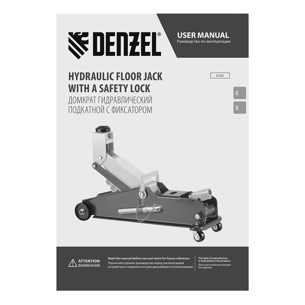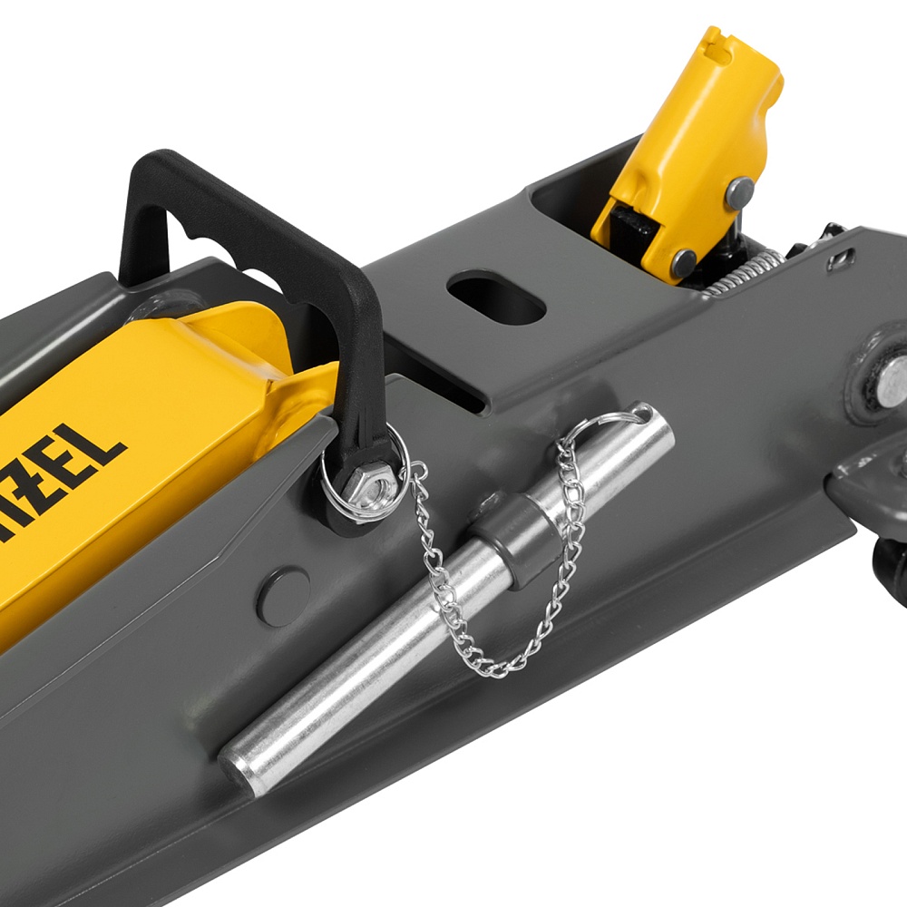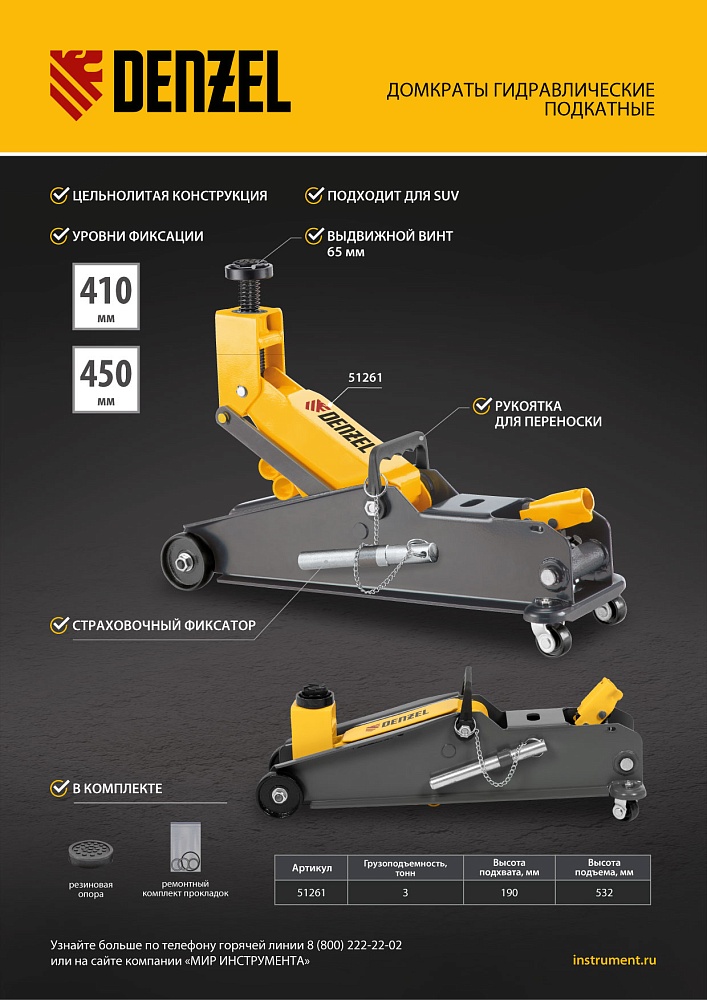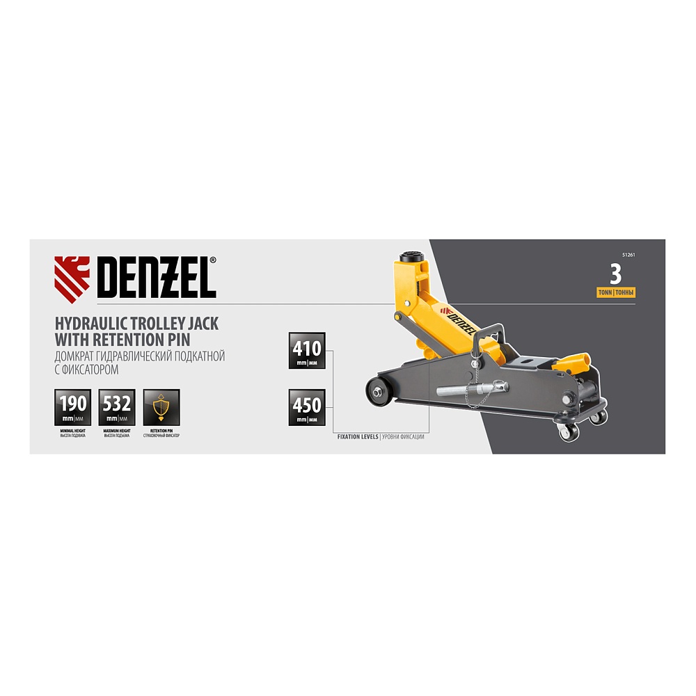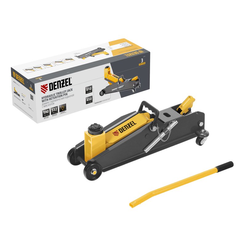 Гидравлический подкатной домкрат Denzel 51261 с фиксатором имеет высоту подхвата 190 мм и предназначен для плавного подъема грузов массой до 3 т (в том числе автомобилей класса SUV) на высоту до 532 мм. Страховочный штифт позволяет фиксировать подъемный рычаг на высоте 410 и 450 мм для безопасной работы. Домкрат пригодится владельцам легковых автомобилей со стандартным клиренсом.