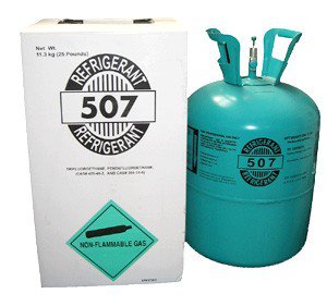 R507 фреон(хладон) – представляет собой равно пропорциональную смесь фреонов R143a и R125. Относится к группе гидрофторуглеродов (ГФУ). Обладает нулевым ODP (потенциалом озоноразрушения), и GWP (потенциал глобального потепления) равным 3900. Относится к азеотропным смесям. Данный фреон был специально создан для закачки в новые холодильные системы и в качестве ретрофиттинга холодильных низкотемпературных установок, работающих на R22, R502. Переход на новых хладагент подразумевает замену фильтра-осушителя, а также предпочтение полиолэфирного масла ранее используемому минеральному. В практике также может потребоваться коррекция некоторых других незначительных компонентов системы. За счет того, что смесь не включает (как, например, R404A) фреон R134a, то это благоприятно сказывается на теплопередаче и эффективности. При низких температурах кипения повышение эффективности может достигать до 15%. При этом температура нагнетания фреона R507 ниже R404A на 1-2°С, а в сравнении с R502 – на 11-12°С. На практике это обращается в преимущество повышения долговечности компрессора за счет оптимизации энергопотребления. Тем не менее к 2030 году согласно решению Европарламента применение фторсодержащих парниковых газов (к которым относится и фреон R507) будет необходимо снизить на 79%.