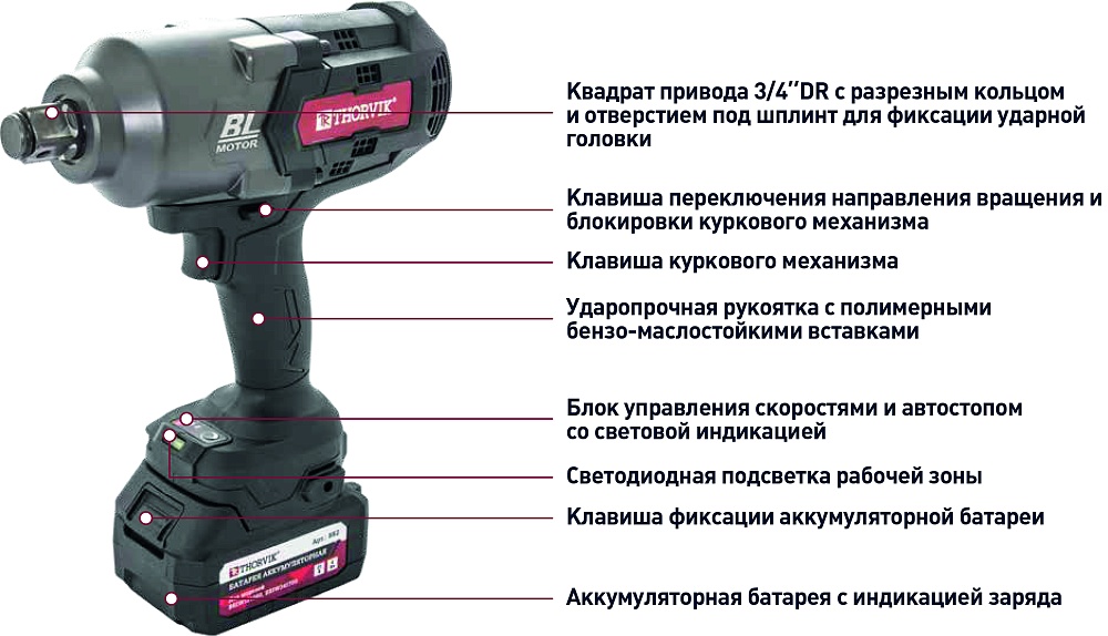 Гайковерт ударный аккумуляторный бесщёточный 3/4"DR, 21В, 1700 Нм. Ударопрочная рукоятка с полимерными бензо-маслостойкими вставками. Блок управления скоростями и автостопом со световой индикацией. Аккумуляторная батарея с индикацией заряда.