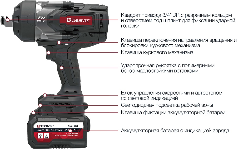 Гайковерт ударный аккумуляторный бесщёточный 3/4"DR, 21В, 2400 Нм. Ударопрочная рукоятка с полимерными бензо-маслостойкими вставками. Блок управления скоростями и автостопом со световой индикацией. Аккумуляторная батарея с индикацией заряда.