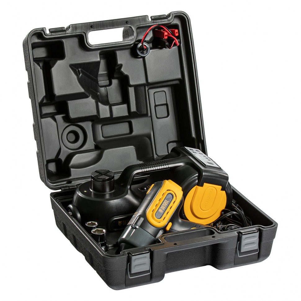 • Продуманная конструкция — в корпусе домкрата имеются отсеки для хранения аксессуаров, а также шланга и кабеля питания.