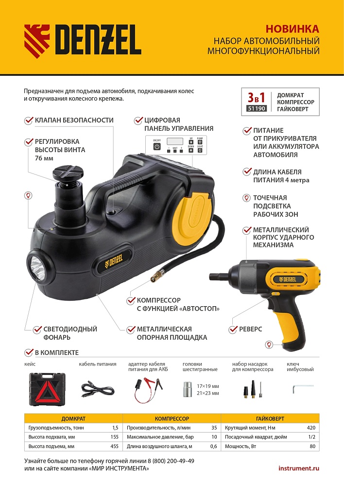 Домкрат электрогидравлический «3 в 1» (1,5 т), 12В, с гайковертом электрическим, в наборе Denzel купить в СПб цена ✅ - Все для СТО