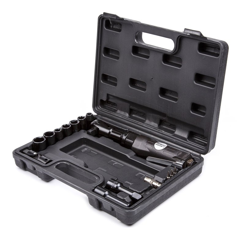 Трещотка пневматическая KRW12RW-T с набором головок  предназначена для облегчения монтажа/демонтажа различных элементов и узлов автомобиля. Имеет широкое применение в автосервисе. За счет работы от линии сжатого воздуха, достигается высокая скорость и эффективность работы. Рабочая головка имеет квадрат сечением 1/2" и расположена под углом 90 градусов к корпусу, что обеспечивает дополнительное удобство при работе в труднодоступных местах.