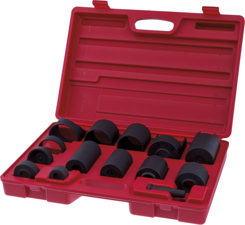 KA-3085 Набор оправок для монтажа/демонтажа элементов подвески. Комплект дополнительных оправок для расширения возможностей KA-4016A. Особенности: Включает в себя все оправки и адаптеры, необходимые для работы с подвеской автомобилей концерна GM, Ford и Dodge моно и полно-приводных пикапов, фургонов и внедорожников до 1997 года выпуска. Подходит для работы с верхними и нижними шаровыми шарнирами. Комплект набора: Втулка сквозная 63,5 мм, длина 69 мм - 1 шт. Втулка сквозная 58 мм, длина 70 мм - 1 шт. Втулка сквозная 63,5 мм, длина 20 мм - 1 шт. Втулка с донышком с вырезом 63 мм, длина 93 мм, глубина 81 мм - 1 шт. Втулка с донышком с вырезом 73 мм, длина 83 мм, глубина 73 мм - 1 шт. Втулка с донышком 50 мм, длина 93 мм, глубина 78 мм - 1 шт. Втулка с донышком 51 мм, длина 74 мм, глубина 60 мм - 1 шт. Втулка с донышком 57 мм, длина 60 мм, глубина 50 мм - 1 шт. Втулка с донышком 63 мм, длина 48 мм, глубина 38 мм - 1 шт. Втулка с донышком усечённая 54 мм, длина 21,5/18 мм, глубина 12/9 мм - 1 шт. Втулка сквозная с вырезом 76,5 мм, длина 58 мм - 1 шт. Втулка с донышком без отверстья 57 мм, длина 18 мм, глубина 12,5 мм - 1 шт. Втулка сквозная наруж. 36,5/31 мм, внут. 20,5 мм, длина 25,5 мм - 1 шт. Адаптер малый наруж. 57 мм, внутр. 46,5 мм - 1 шт. Толкатель 16 мм, длина 76,5 мм - 1 шт. Инструкция - 1 шт. Кейс пластиковый - 1 шт. Использование набора допускается только квалифицированным персоналом с соблюдением техники безопасности!