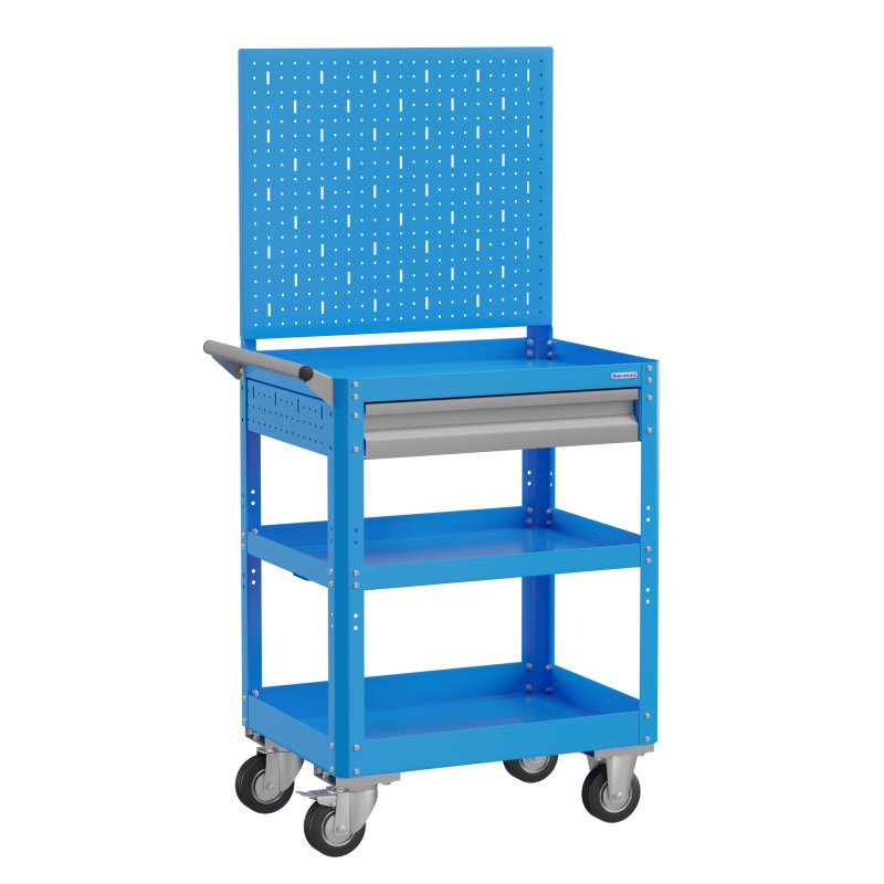 С перфорированной панелью для навесных элементов и выдвижным ящиком на шариковых телескопических направляющих. Общая равномерно-распределённая нагрузка на тележку - до 100кг. Корпус выполнен из листовой стали толщиной от 0,6 до 1,5мм., покрыт полимерной порошковой краской. Верхняя и средняя полка имеют высоту борта 40мм., нижняя полка имеет высоту борта 60мм