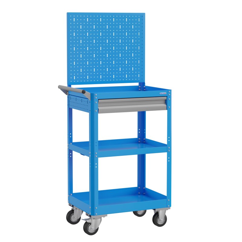 С перфорированной панелью для навесных элементов и выдвижным ящиком на шариковых телескопических направляющих. Общая равномерно-распределённая нагрузка на тележку - до 100кг. Корпус выполнен из листовой стали толщиной от 0,6 до 1,5мм., покрыт полимерной порошковой краской. Верхняя и средняя полка имеют высоту борта 40мм., нижняя полка имеет высоту борта 60мм