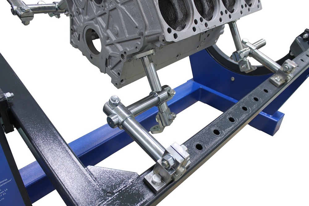 Конструкция стенда позволяет вывешивать ремонтируемый агрегат в удобной позиции для его последующей разборки и сборки. Поворот рамы на 360° позволяет проводить разборку и сборку любых труднодоступных узлов двигателей.