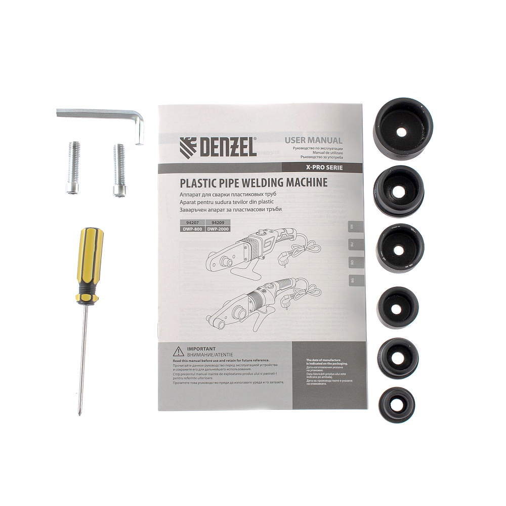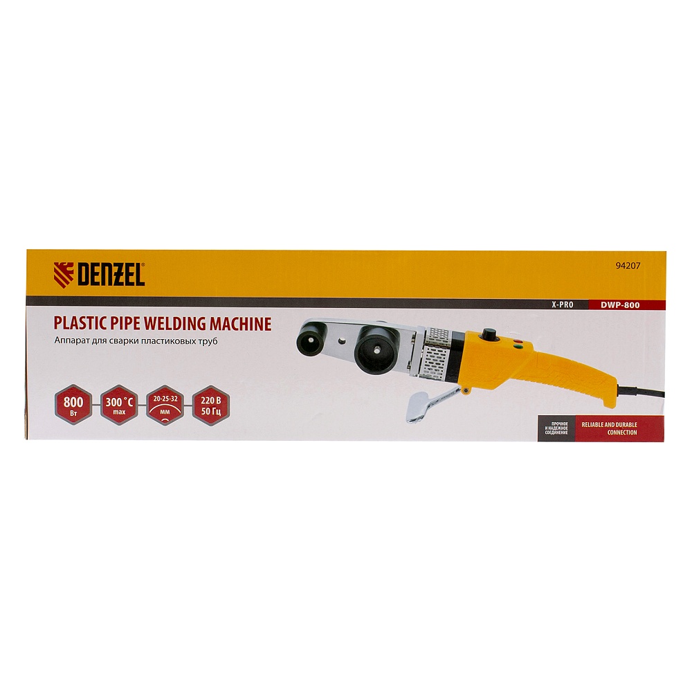 <p>Аппарат для сварки пластиковых труб Denzel DWP-800 X-PRO 94207 мощностью 800 Вт, с комплектом насадок диаметром 20-32 мм, работает при температуре 260-300 ℃. Используется для сварки полиэтиленовых и полипропиленовых труб путем их нагрева, размягчения и последующего соединения под давлением. Оптимально подходит для самостоятельного обновления водопровода, ремонта труб, монтажа отопительной и канализационной систем в частном доме или квартире. Три сменные насадки позволяют соединять трубы диаметром 20, 25 и 32 мм.</p><h2>Преимущества</h2><ul><li>Плавное изменение температуры — в верхней части корпуса имеется поворотный регулятор.</li><li>Прочные насадки — антипригарное покрытие защищает их от налипания пластика и разрушения.</li><li>Индикация работы — световые элементы помогают определить, что аппарат включен в сеть, и избежать контакта с нагретой поверхностью.</li><li>Удобная подставка — инструмент надежно устанавливается на рабочую поверхность.</li><li>Комфортная работа — рукоятка с рельефным покрытием обеспечивает удобный захват, а малый вес 2,5 кг и вытянутая форма облегчают доступ в тесные места.</li><li>Полная комплектация — к паяльнику прилагаются сменные насадки и отвертка, что позволяет сразу приступить к работе. </li><li>Удобное хранение и транспортировка — аппарат поставляется в металлическом кейсе с крепежом для каждой детали.</li><li>Гарантия 3 года — высокое качество аппарата подтверждено производителем.</li></ul>