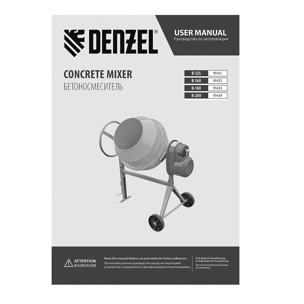 <p>Бетоносмеситель Denzel B-160 95422 используется для приготовления раствора цемента, бетона или других смесей. Усиленная конструкция, оптимальное соотношение мощности двигателя 700 Вт и объема бака 160 л позволяют использовать устройство в режиме высокой нагрузки. Бетоносмеситель пригодится при проведении ремонтных работ и частном строительстве. Барабан объемом 160 л обеспечивает получение до 80 л готовой смеси (±10 %).</p><h2>Преимущества</h2><ul><li>Защита от перегрева — если неопытный пользователь перегрузит барабан, датчик термозащиты незамедлительно отключит питание, это позволит предотвратить повреждение обмотки двигателя.</li><li>Долговечность — барабан выполнен из стальных листов увеличенной толщины (верх 1,5 мм / низ 2 мм) и покрыт порошковой краской для защиты от коррозии.</li><li>Высокая металлоемкость конструкции — за счет применения усиленных узлов и элементов бетоносмеситель выдерживает повышенные нагрузки.</li><li>Безопасная эксплуатация — ведущая шестерня закрыта широким защитным кожухом, предотвращающим затягивание посторонних предметов в привод.</li><li>Прочность — шестерня и венец сделаны из чугуна, в конструкции венца нет ослабляющих сквозных отверстий, т.к. он крепится к барабану через проушины, вынесенные за его тело.</li><li>Надежность и высокий ресурс — втулка, передающая вращение от вала непосредственно ведомому шкиву, произведена из прочной стали.</li><li>Фиксация угла наклона барабана — в конструкции бетоносмесителя предусмотрена педаль, позволяющая фиксировать бак в нужном положении и дозировать выгрузку готовой смеси.</li><li>Возможность экстренного выключения — при возникновении внештатной ситуации достаточно просто «стукнуть» по большой наружной кнопке, и работа двигателя моментально прекратится.</li><li>II класс защиты от поражения электрическим током — устройство имеет двойную изоляцию токопроводящих элементов, что подтверждено сертификатом.</li><li>Сниженный уровень шума 86 дБ — толщина венца увеличена, поэтому бетоносмеситель работает тише по сравнению с классическими моделями, также уменьшается уровень вибраций.</li><li>Защита от коррозии — бак окрашен стойкой порошковой краской, она не стирается со временем и долго сохраняет первозданный вид.</li><li>Простое обслуживание — узел крепления оси барабана легко разбирается, это значительно упрощает замену подшипников.</li><li>Удобная транспортировка — колеса упрощают перемещение бетоносмесителя по строительной площадке.</li><li>Степень защиты внутренних узлов IP44 — двигатель закрыт корпусом, кнопки управления — пластиковой крышкой, не допускающей попадания строительной пыли и влаги.</li><li>Гарантия 3 года — высокое качество бетоносмесителя подтверждено производителем.</li></ul>