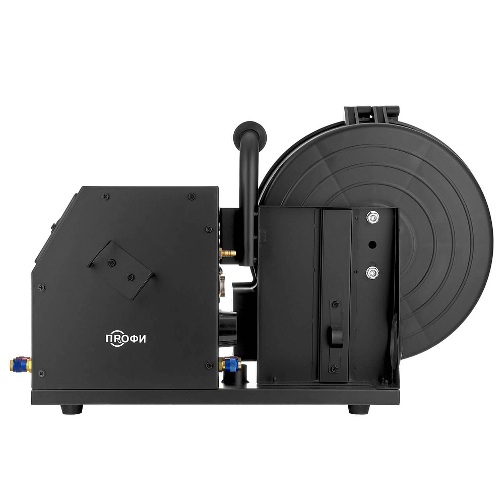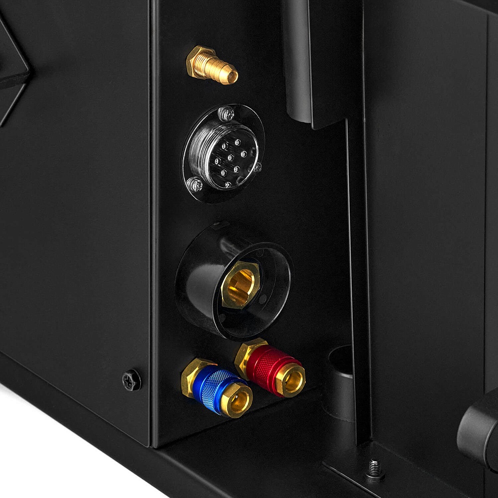На передней панели установлены регуляторы скорости подачи проволоки и сварочного напряжения, кнопка протяжки проволоки, разъемы для подключения сварочной горелки MIG с водяным охлаждением.