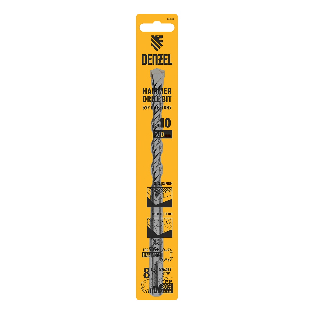 <p>Бур по бетону Denzel Cobalt W-tip 705016 размером 10 х 160 мм, с хвостовиком SDS-plus и двойной спиралью, предназначен для сверления бетона, кирпича и камня. Используется в качестве оснастки для перфораторов с патроном SDS-plus. Бур оптимален для проведения строительных, ремонтных, монтажных работ.</p><h2>Преимущества</h2><ul><li>Высокий ресурс — режущая твердосплавная пластина из сплава ВК8 твердостью 80-90 HRC с W-образной заточкой позволяет увеличить скорость работы на 30%, в том числе при сверлении камня.</li><li>Прочность и износостойкость — рабочая часть из легированной стали 40Х выдерживает интенсивные и длительные ударные нагрузки, что делает бур самым высокопроизводительным среди аналогов средней цены.</li><li>Эффективный отвод шлама — двойная спираль и канавка с дополнительным желобом обеспечивают быстрое удаление пыли, что предотвращает перегрев рабочей части и продлевает срок службы бура.</li><li>Высокая технологичность — бур изготовлен в соответствии с Европейским стандартом, что гарантирует его качество и эффективность сверления.</li><li>Удобное хранение — оснастка поставляется в упаковке с европодвесом.</li></ul>