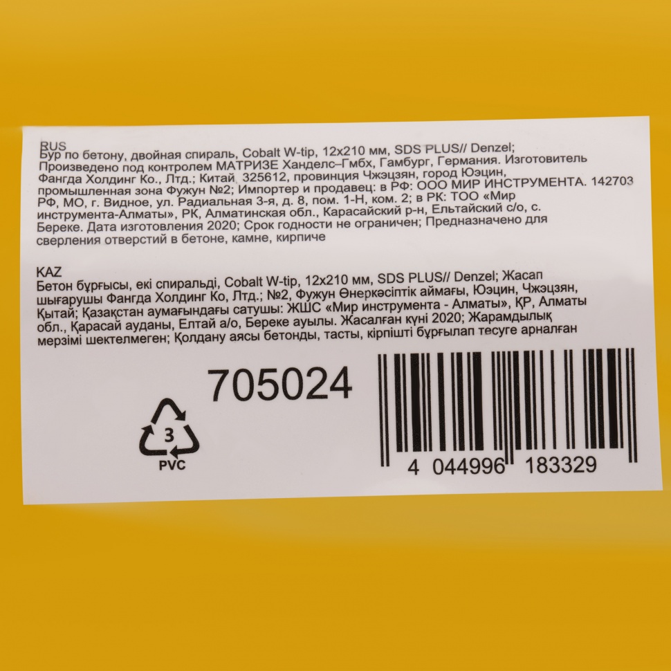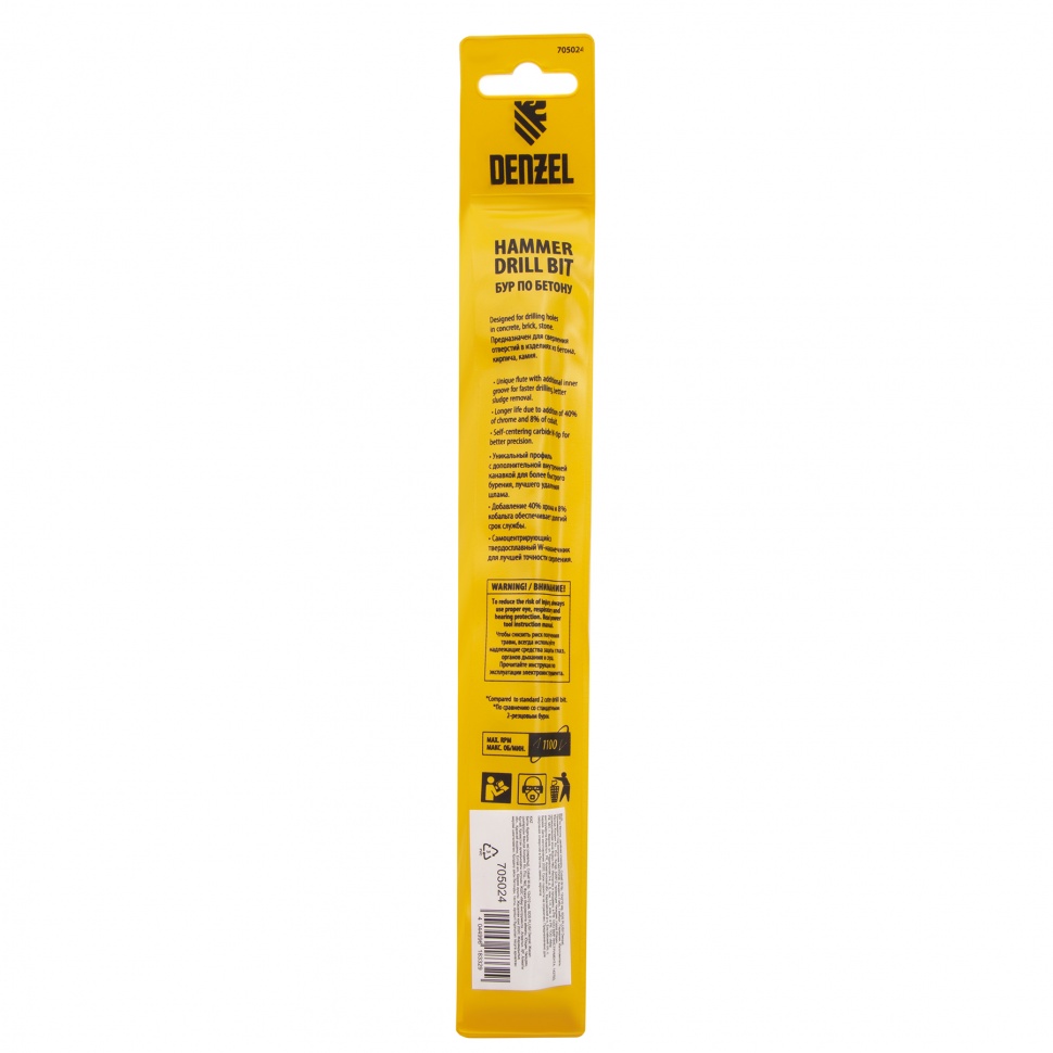 <p>Бур по бетону Denzel Cobalt W-tip 705024 размером 12 х 210 мм, с хвостовиком SDS-plus и двойной спиралью, предназначен для сверления бетона, кирпича и камня. Используется в качестве оснастки для перфораторов с патроном SDS-plus. Бур оптимален для проведения строительных, ремонтных, монтажных работ.</p><h2>Преимущества</h2><ul><li>Высокий ресурс — режущая твердосплавная пластина из сплава ВК8 твердостью 80-90 HRC с W-образной заточкой позволяет увеличить скорость работы на 30%, в том числе при сверлении камня.</li><li>Прочность и износостойкость — рабочая часть из легированной стали 40Х выдерживает интенсивные и длительные ударные нагрузки, что делает бур самым высокопроизводительным среди аналогов средней цены.</li><li>Эффективный отвод шлама — двойная спираль и канавка с дополнительным желобом обеспечивают быстрое удаление пыли, что предотвращает перегрев рабочей части и продлевает срок службы бура.</li><li>Высокая технологичность — бур изготовлен в соответствии с Европейским стандартом, что гарантирует его качество и эффективность сверления.</li><li>Удобное хранение — оснастка поставляется в упаковке с европодвесом.</li></ul>