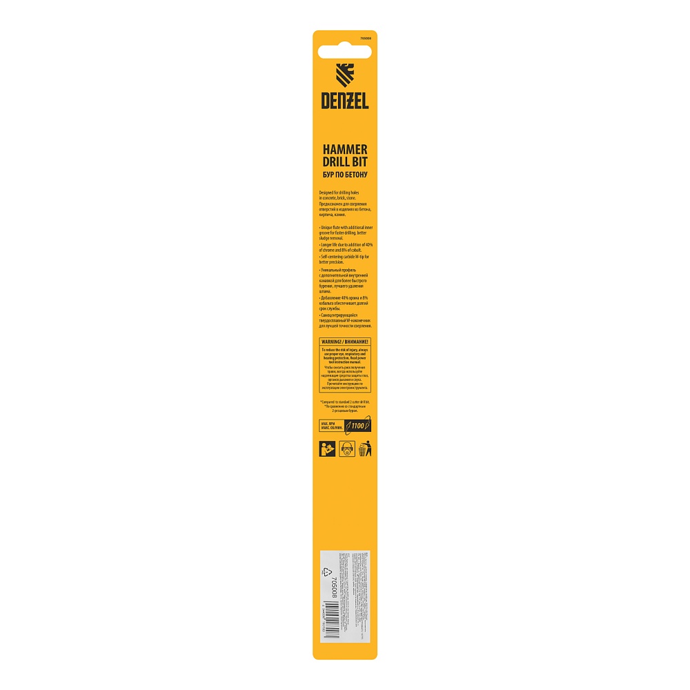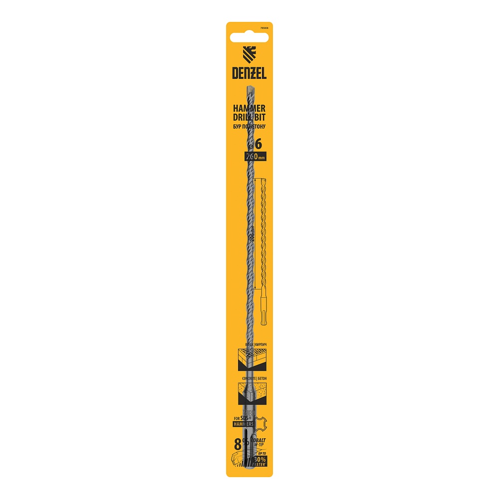 <p>Бур по бетону Denzel Cobalt W-tip 705008 размером 6 х 260 мм, с хвостовиком SDS-plus и двойной спиралью, предназначен для сверления бетона, кирпича и камня. Используется в качестве оснастки для перфораторов с патроном SDS-plus. Бур оптимален для проведения строительных, ремонтных, монтажных работ.</p><h2>Преимущества</h2><ul><li>Высокий ресурс — режущая твердосплавная пластина из сплава ВК8 твердостью 80-90 HRC с W-образной заточкой позволяет увеличить скорость работы на 30%, в том числе при сверлении камня.</li><li>Прочность и износостойкость — рабочая часть из легированной стали 40Х выдерживает интенсивные и длительные ударные нагрузки, что делает бур самым высокопроизводительным среди аналогов средней цены.</li><li>Эффективный отвод шлама — двойная спираль и канавка с дополнительным желобом обеспечивают быстрое удаление пыли, что предотвращает перегрев рабочей части и продлевает срок службы бура.</li><li>Высокая технологичность — бур изготовлен в соответствии с Европейским стандартом, что гарантирует его качество и эффективность сверления.</li><li>Удобное хранение — оснастка поставляется в упаковке с европодвесом.</li></ul>