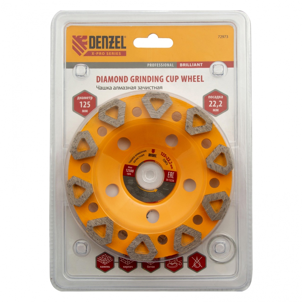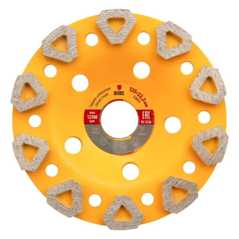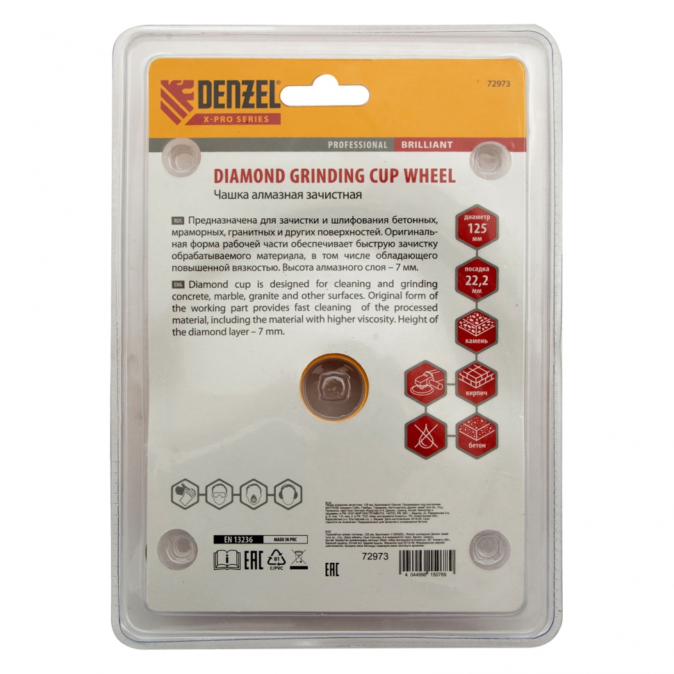 <p>Алмазная зачистная чашка Denzel «Бриллиант» 72973 с посадочным отверстием 22,2 мм устанавливается на углошлифовальные машины, работающие с оснастками диаметром 125 мм. Ее используют для обработки бетонных, каменных, гранитных, мраморных поверхностей и кирпичных кладок. Рабочий слой с высокой концентрацией алмазов и сбалансированной связкой устраняет неровности, зачищает швы, выравнивает стыки, удаляет наплывы (в несколько этапов), а также придает обрабатываемому материалу гладкость. Насадка рекомендована для профессионального применения.</p><h2>Преимущества</h2><ul><li>Эффективное охлаждение — алмазные сегменты особой формы обеспечивают выброс шлама и отвод тепла.</li><li>Удаление пыли — в корпусе чашки имеются специальные отверстия.</li><li>Защита от коррозии — стальная поверхность чаши покрыта эмалью.</li><li>Высокий ресурс — высота алмазного слоя составляет 6 мм.</li><li>Гарантированное качество — чашка произведена на фирменном заводе под строгим технологическим контролем.</li></ul>