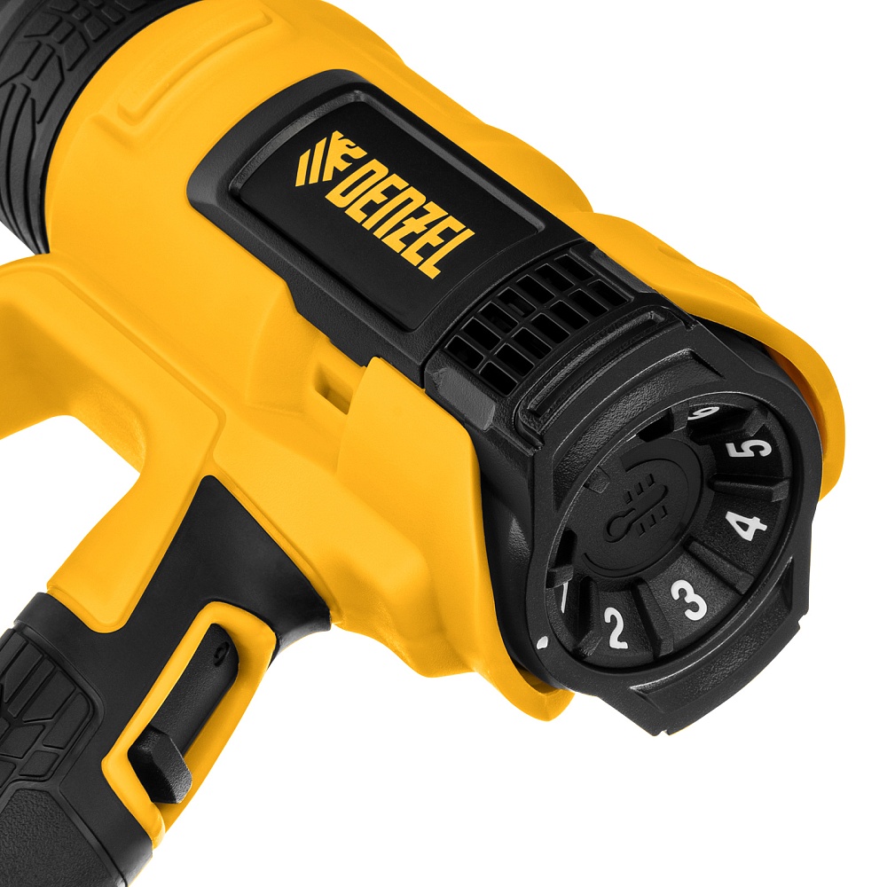 <p>Фен технический Denzel HG-2000M 28005 мощностью 2000 Вт, с 3 режимами работы, подходит для снятия лака и краски с различных поверхностей, размораживания и пайки труб, создания изгиба в пластиковых деталях, генерации точечного теплового потока для нагрева небольших участков и др. Справиться с этими задачами помогает треугольный скребок и 4 насадки: плоская, полукруглая, отражающая и редукционная.,Мощность фена 2 кВт обеспечивает стабильную производительность на уровне 250/500 л/мин, в зависимости от выбранного режима. Температура выходящего потока составляет 50/50-450/50-600 ℃.</p><h2>Преимущества</h2><ul><li>3 режима работы — низкая производительность с выбором температуры, высокая производительность с выбором температуры и режим продувки, позволяющий охладить фен и исключить тепловой удар после отключения.</li><li>Многозадачность — плавная аналоговая настройка температуры обеспечивает выполнение целого спектра задач — от деликатного просушивания до сварки и пайки.</li><li>Двухуровневая защита — фен отключается при риске перегрева или перегрузки, это позволяет избежать поломок и сохранить рабочий ресурс инструмента.</li><li>Качественная сборка — переключатель режимов безупречно справляется со своими задачами даже спустя длительное время.</li><li>Продуманная конструкция — фен можно зафиксировать в вертикальном положении соплом вверх, это помогает избежать отключения при перерыве в работе.</li><li>Безопасный захват — D-образная рукоятка исключает случайное соприкосновение с разогретой поверхностью.</li><li>Кабель питания длиной 3 м с резиновой изоляцией — можно расширить рабочую зону без помощи удлинителя, работать при температуре от 0 ℃ и без риска поломки подвергать фен кратковременному воздействию высоких температур.</li><li>Небольшой вес 940 г — инструментом удобно работать даже длительное время.</li><li>Гарантия 3 года — высокое качество фена подтверждено производителем.</li></ul>