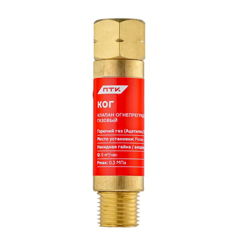 Клапан огнепреградительный газовый КОГ (на резак или горелку) М16х1,5LH предназначен для защиты от противотока газа, а также для защиты от разрыва газового резинотканевого рукава и его возгорания при обратном ударе пламени.