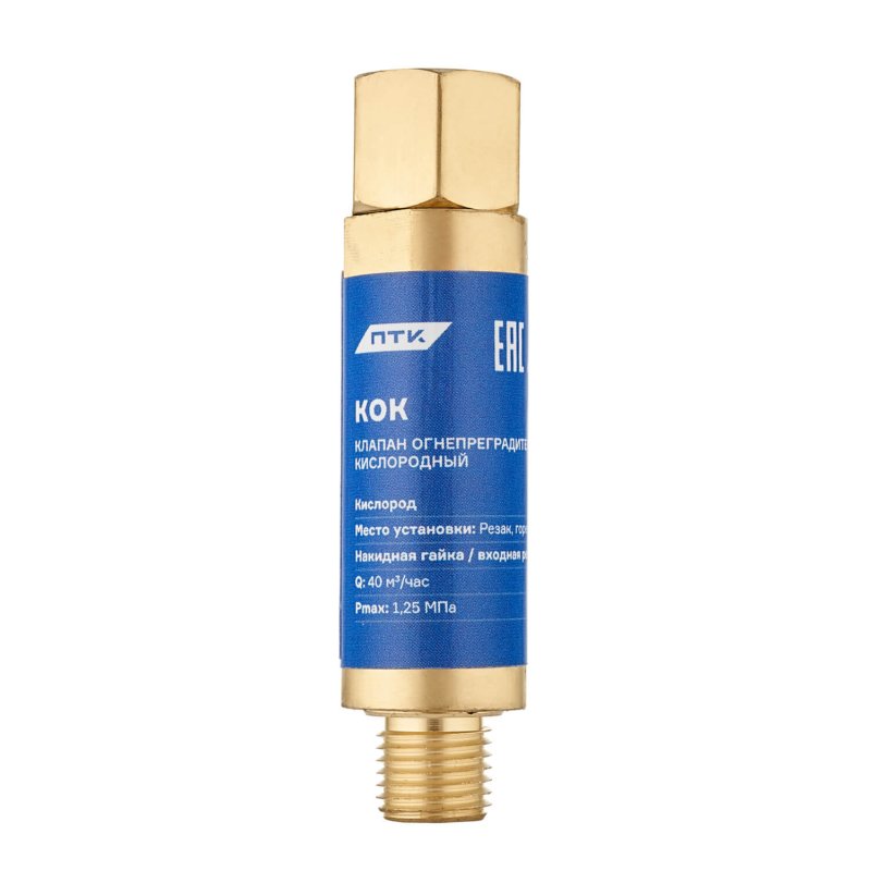 Клапан огнепреградительный кислородный КОК (на резак или горелку) М12х1,25 предназначен для защиты от противотока газа, а также для защиты от разрыва кислородного резинотканевого рукава и его возгорания при обратном ударе пламени.