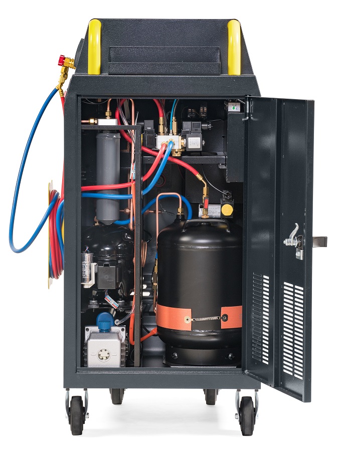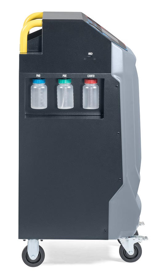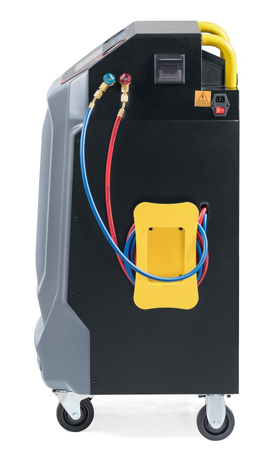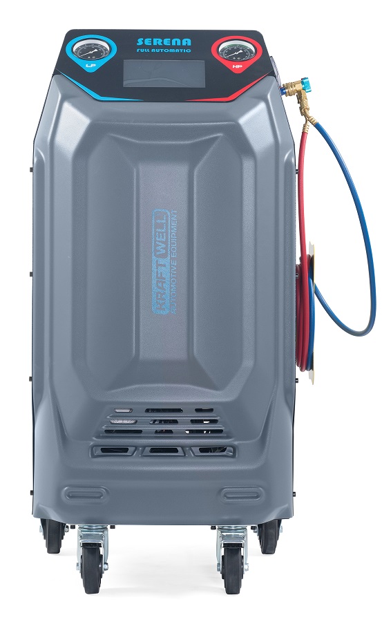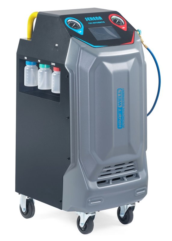 SERENA KraftWell Полностью автоматическая установка для обслуживания систем кондиционирования легковых автомобилей с фреоном R-134a. Сенсорный дисплей 7". Совместима с автомобилями с ДВС, электрмобилями и гибридами. Функции: откачивание и очистка хладагента из системы, отделение и последующий сброс масла, вакуумирование системы, автоматическая заправка фреона и масла.