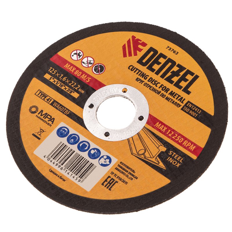 <p>Отрезной круг по металлу Denzel WA60TBF 73763 размером 125 х 1,6 х 22,2 мм рассчитан на интенсивную работу с УШМ. Подходит для резки углеродистой и нержавеющей легированной стали. Круг можно использовать не только в быту, но и для решения профессиональных задач.</p><h2>Преимущества</h2><ul><li>Эффективность — абразив из белого электрокорунда со специальными добавками быстро режет сталь, в т.ч. нержавеющую, и не перегревается, в отличие от оксида алюминия.</li><li>Аккуратная работа — благодаря толщине 1,6 мм и средней по плотности структуре круг обеспечивает ровный и чистый рез.</li><li>Надежность — оптимально подобранная теплостойкая бакелитовая связка с упрочняющими элементами крепко удерживает абразив.</li><li>Безопасная работа — усиленная стеклосетка увеличивает прочность круга на разрыв, предотвращая его разрушение при высоких нагрузках.</li><li>Высокое качество — круг прошел строгий технологический контроль на каждом этапе производства.</li></ul>