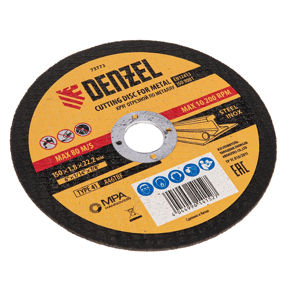 <p>Отрезной круг по металлу Denzel A46TBF 73773 размером 150 х 1,8 х 22,2 мм рассчитан на интенсивную работу с УШМ. Подходит для резки углеродистой и нержавеющей легированной стали. Круг можно использовать не только в быту, но и для решения профессиональных задач.</p><h2>Преимущества</h2><ul><li>Эффективность — абразив из белого электрокорунда со специальными добавками быстро режет материал, в т.ч. нержавеющие стали, и не перегревается, в отличие от оксида алюминия.</li><li>Высокий ресурс — благодаря толщине 1,8 мм и средней по плотности структуре круг стабильно режет сталь даже при больших объемах работ.</li><li>Надежность — оптимально подобранная теплостойкая бакелитовая связка с упрочняющими элементами крепко удерживает абразив.</li><li>Безопасная работа — усиленная стеклосетка увеличивает прочность круга на разрыв, предотвращая его разрушение при высоких нагрузках.</li><li>Высокое качество — круг прошел строгий технологический контроль на каждом этапе производства.</li></ul>
